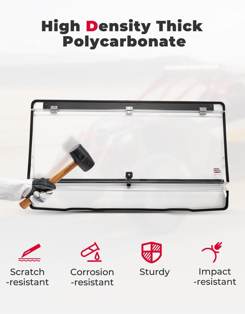 Made of 1/5 inch thick PC material, the KEMIMOTO windshield is shock-, shatter-, and corrosion-resistant, 250x stronger than glass and 25x stronger than acrylic. A polycarbonate front windshield ensures good light transmission and helps soften UV radiation.