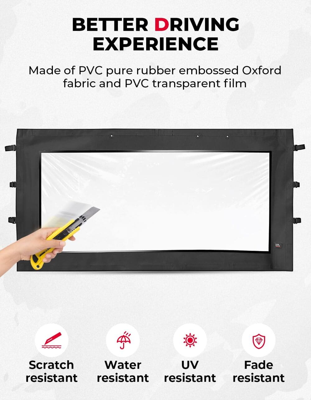 The soft front window is made of compound Oxford fabric, waterproof and tear-resistant, which can withstand harsh weather conditions and rough terrain, and ensures a safe and enjoyable driving experience.