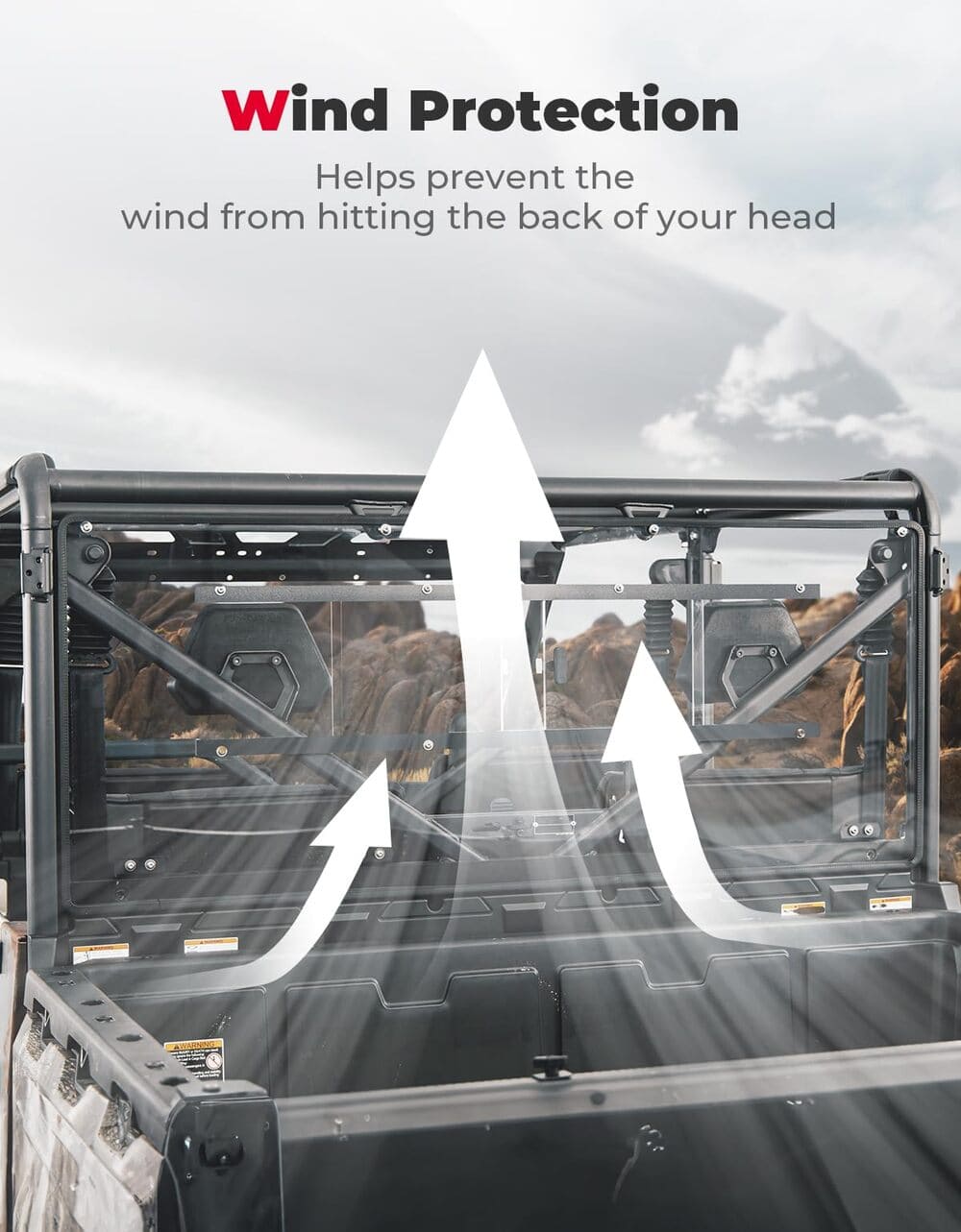 Upgrade your CFMOTO UForce 1000 / 1000XL with the Kemimoto rear sliding windshield! This 2-in-1 design has adjustable sliding vents for cool airflow in the summer and full closure to keep out cold winter wind. It’s the perfect year-round companion, protecting you from mud, dust, rain, wind, and bugs while reducing noise so you can enjoy your favorite tunes. Made from super strong polycarbonate, it’s 250 times stronger than glass and 25 times tougher than acrylic. Plus, it's a breeze to install and remove with its pre-installed rubber strips. Don't miss out on this incredible upgrade—make your rides safer and more comfortable today.