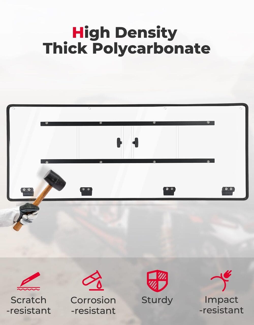 Made of 1/5 inch thick PC material, KEMIMOTO rear window is shock-, shatter- and corrosion-resistant, 250x stronger than glass and 25x stronger than acrylic. Polycarbonate windshield ensures good light transmission and helps soften UV radiation.