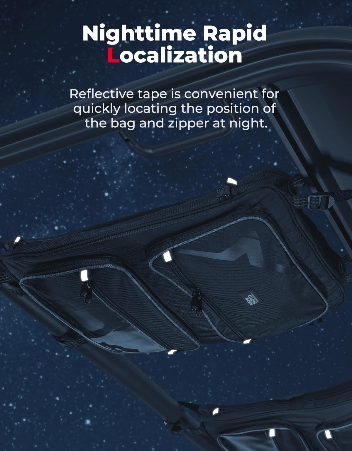 The side storage pockets are interconnecting and make it more convenient to access items. The anti-slip mesh prevents items from slipping out, while the reflective straps quickly locate the position of the zipper at night.