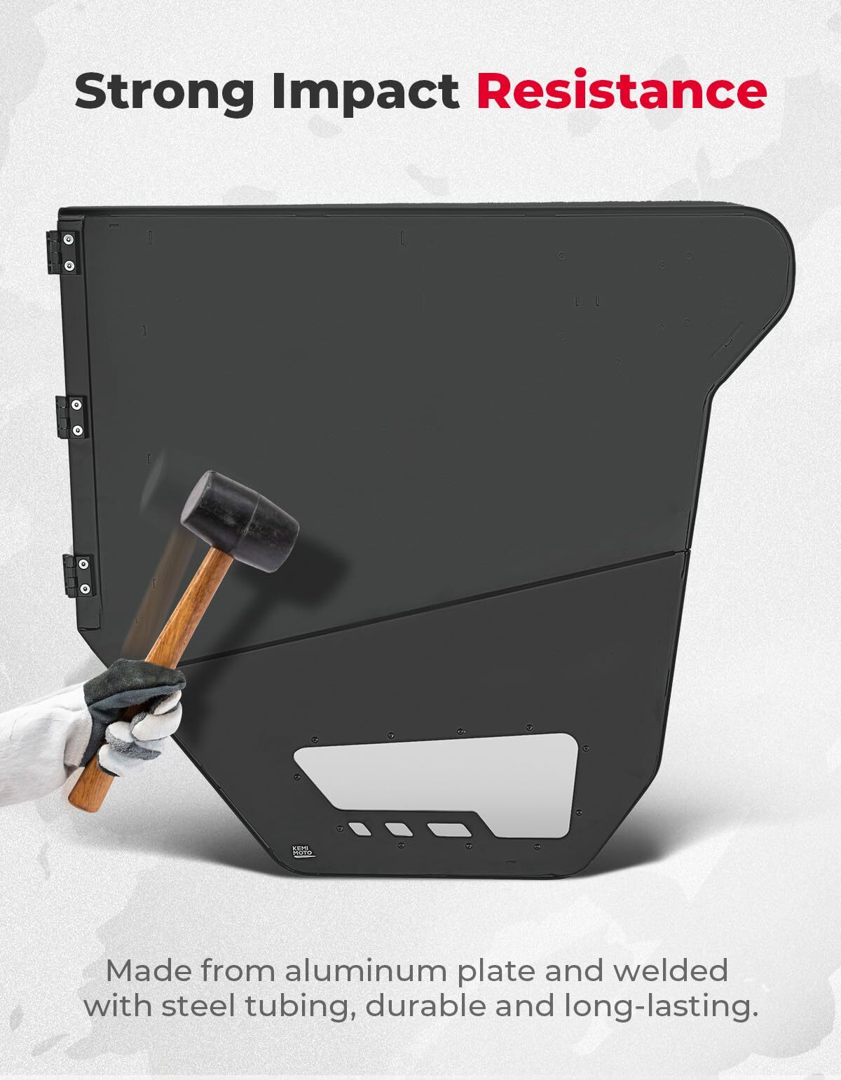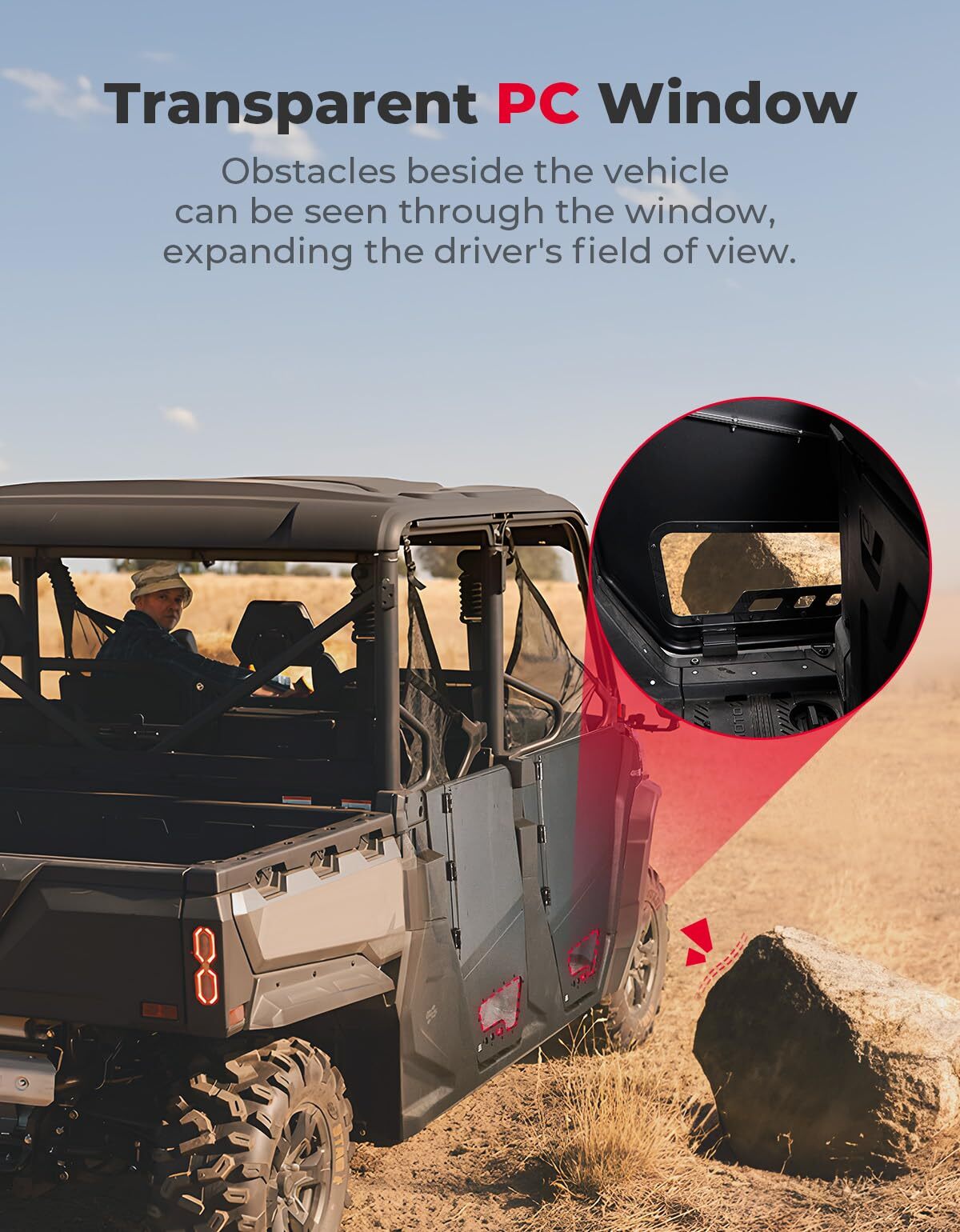 The bottom of the aluminum half-door comes with a thickened PC panel, enabling drivers to check road conditions at any time and offering a safe and reliable driving experience.