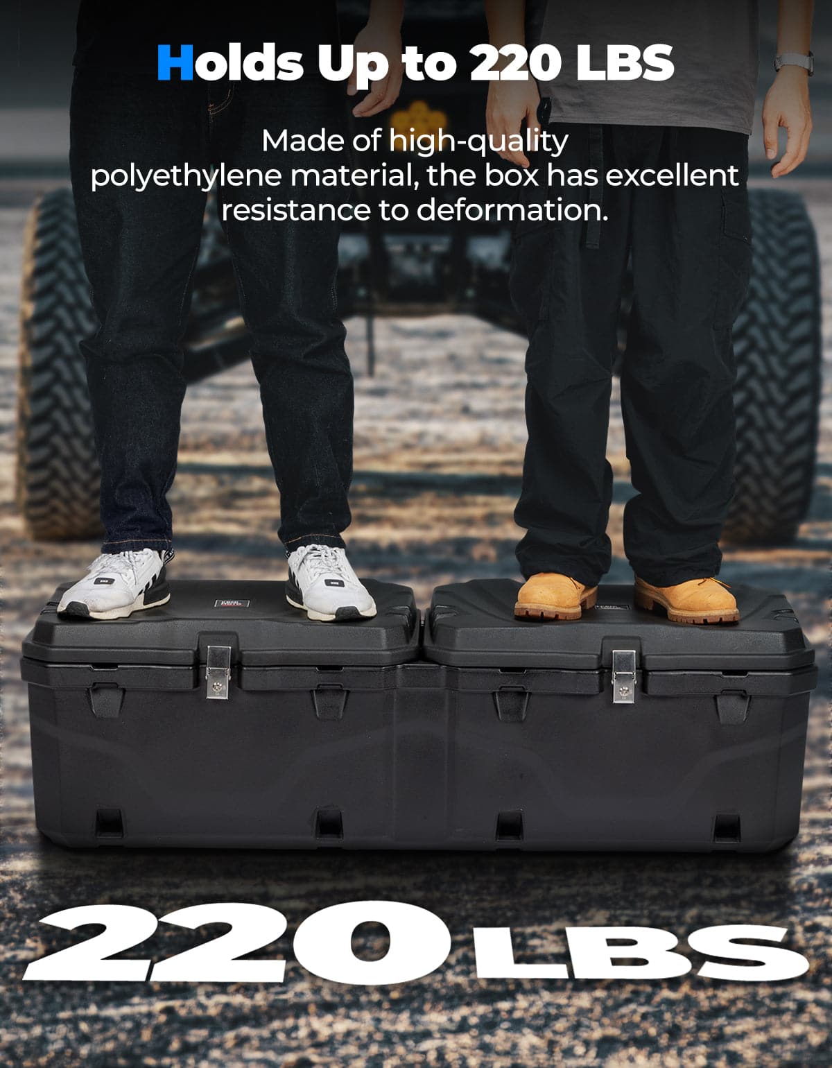 Kemimoto 110L large utv bed storage box is not only capable of storing small items, but it can also store shovels, spades, and trail riding repairs. The dual-lid design allows easy access from both sides of your vehicle, so you don't have to struggle with heavy lids.