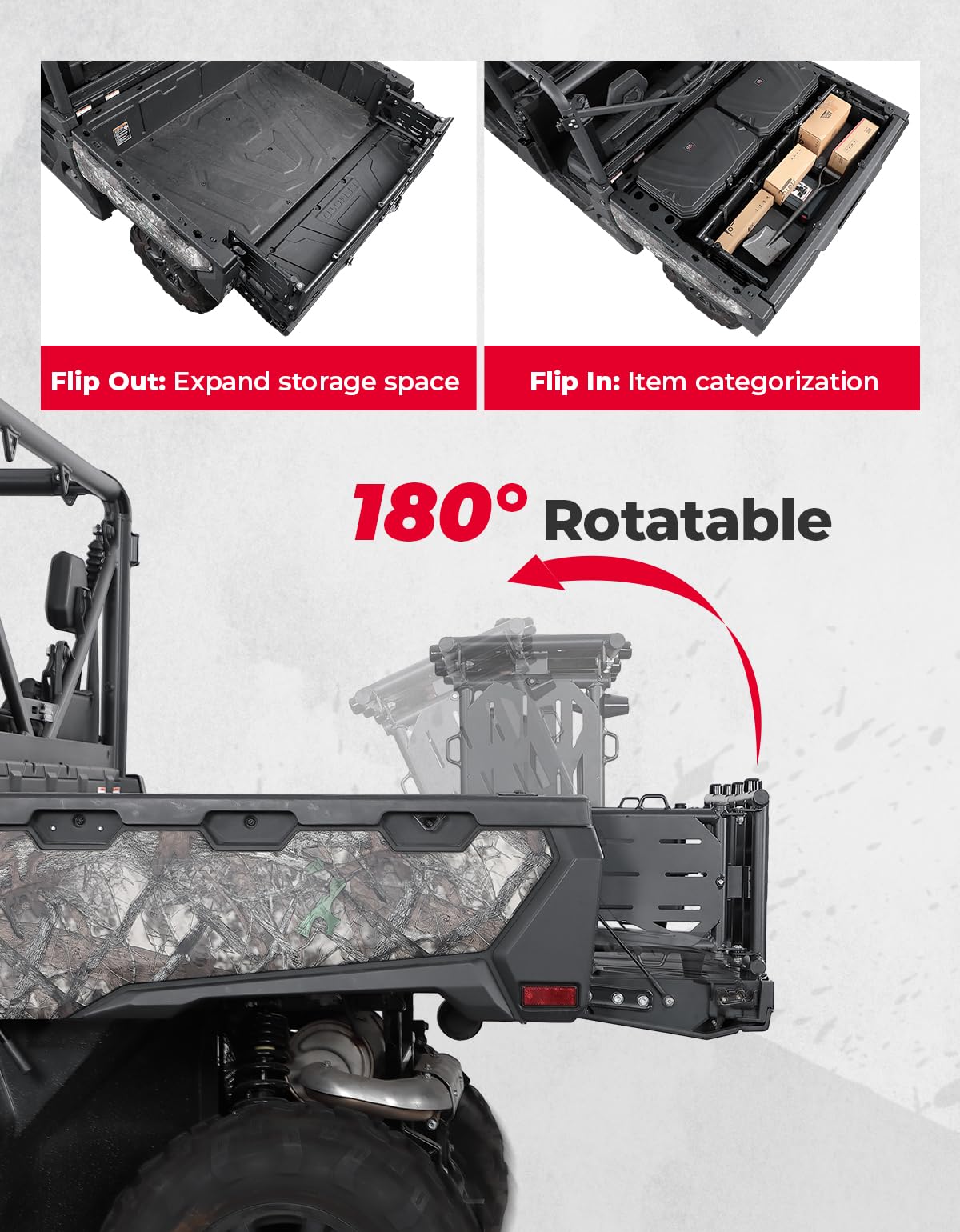 Kemimoto rear tailgate extender can be flipped 180 degrees according to your needs, allowing for expanded space when flipped outward and categorized storage when flipped inward.