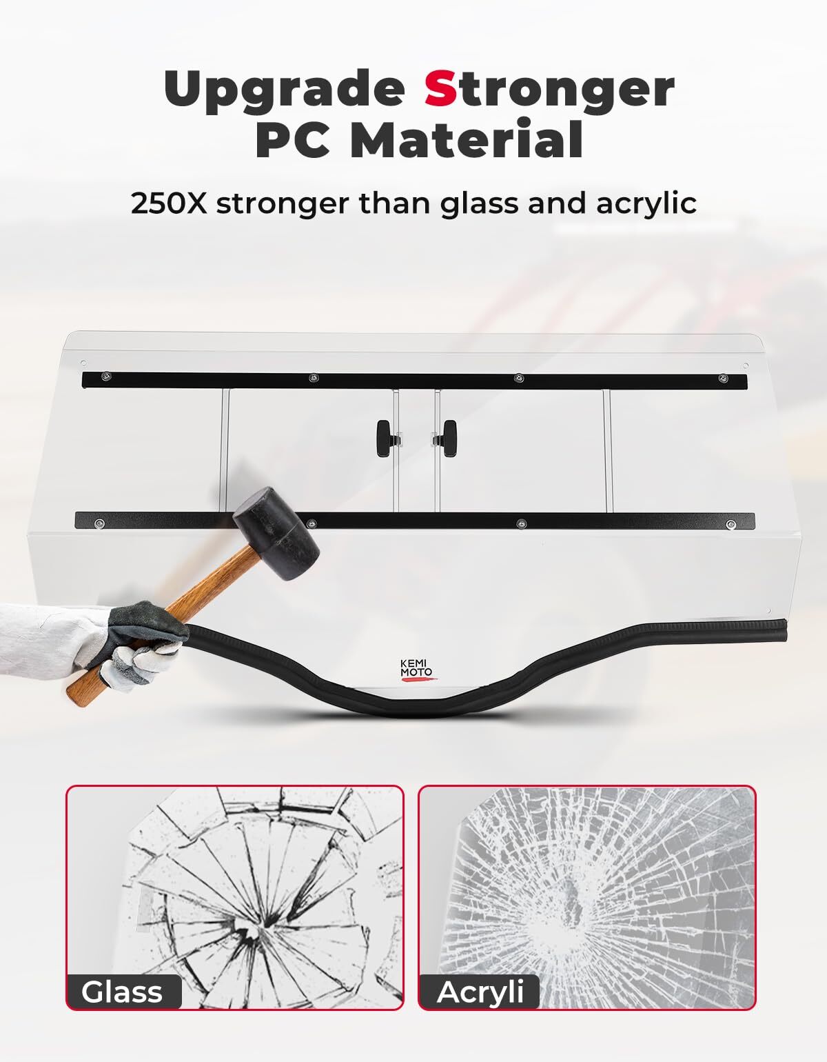 Kemimoto full windshield is made of hardened PC and is 250x stronger than glass and 20x better than PMMA. The windshield doesn't break even if the flying stones, branches, dirt, and debris hit it when you ride on rough mountain roads, dense forests, or muddy roads.