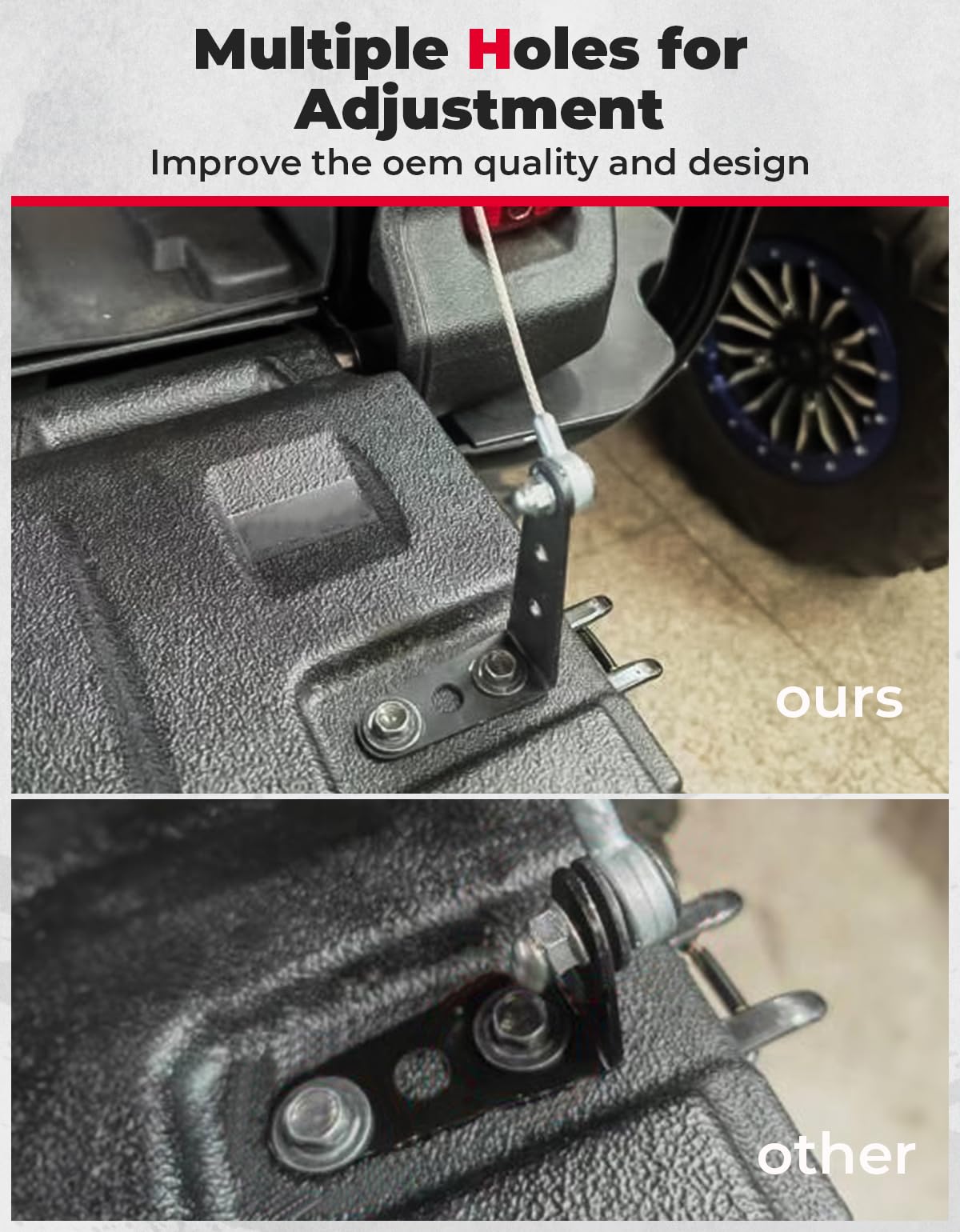 The bracket allows for 3 modes of adjustment of the tailgate's height, ensuring that it is level with the bed of the UTV. This helps in loading and unloading cargo more smoothly.