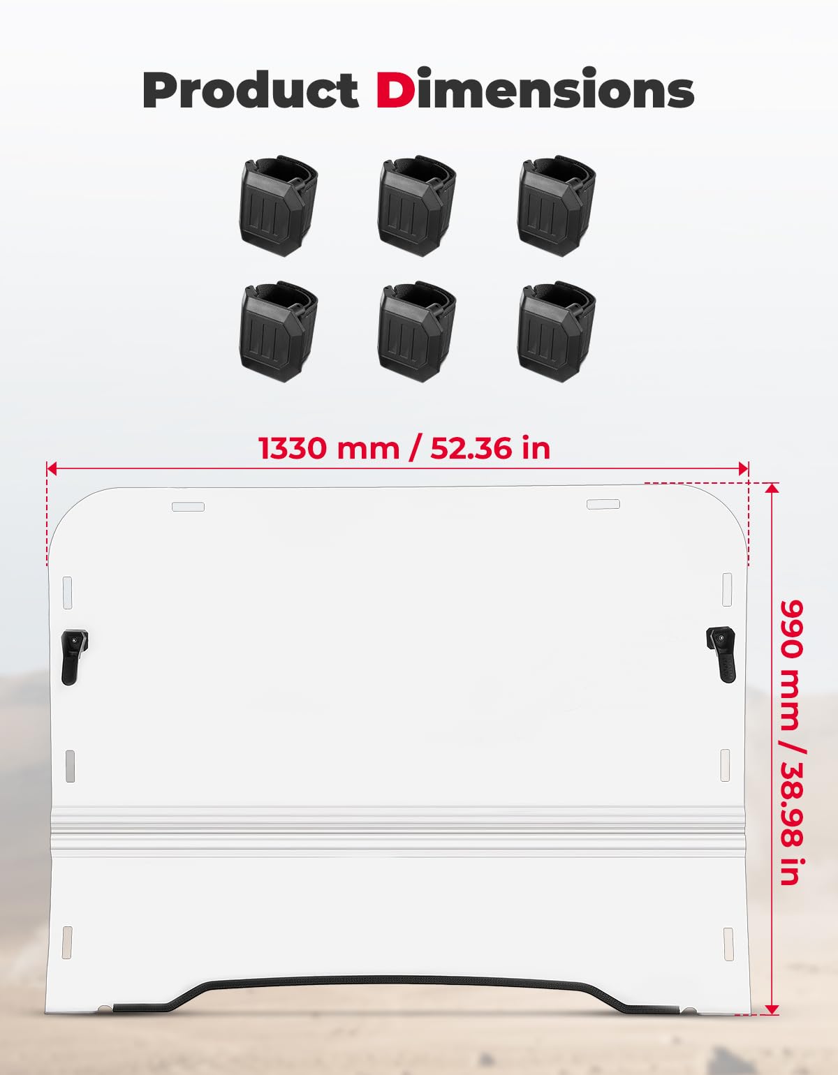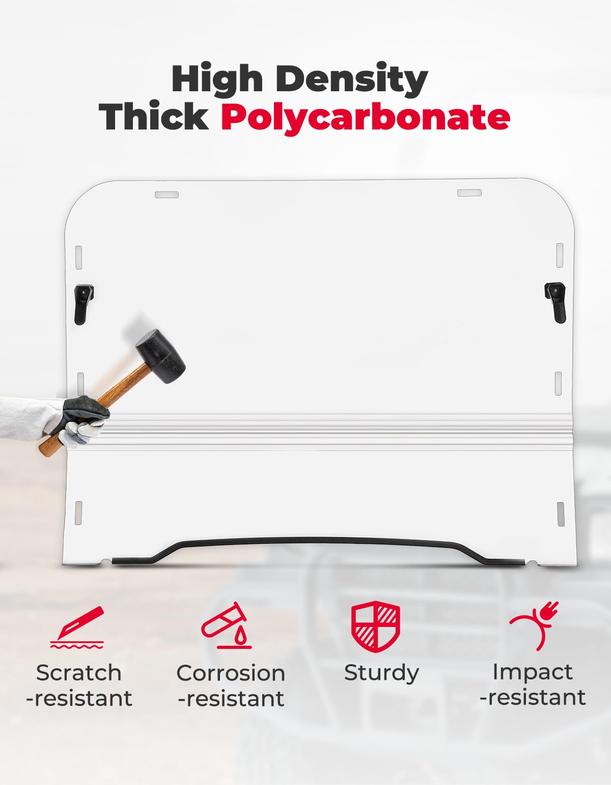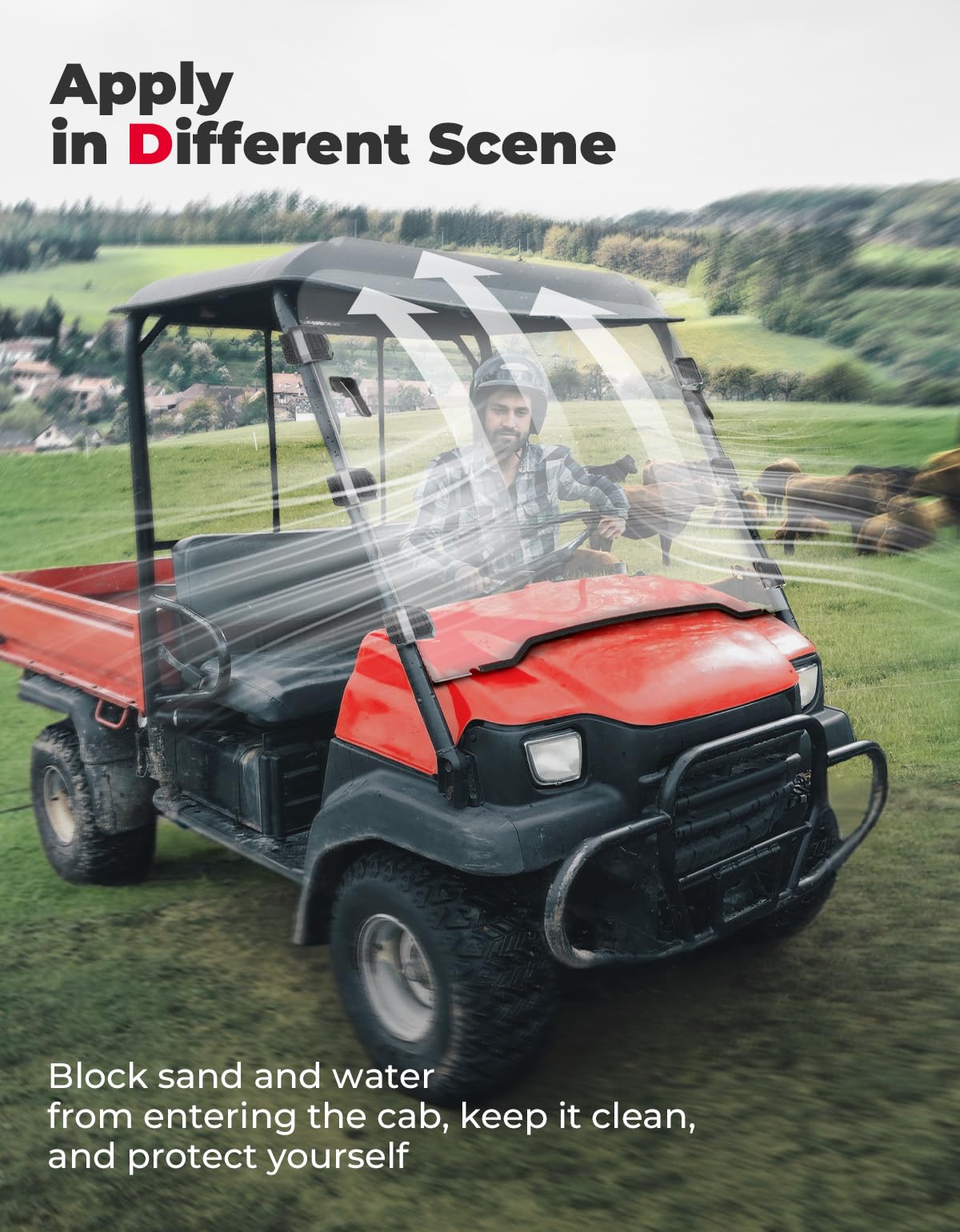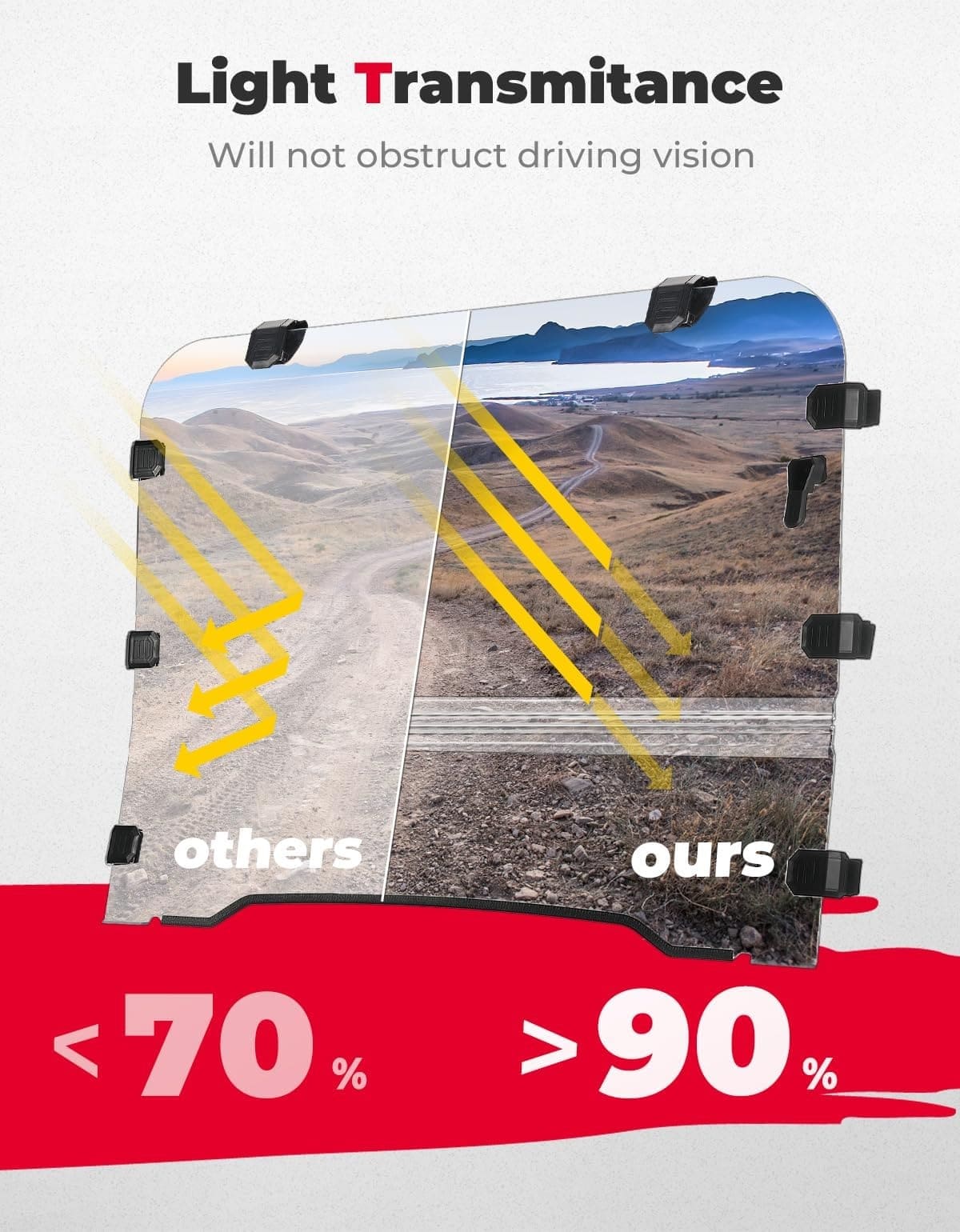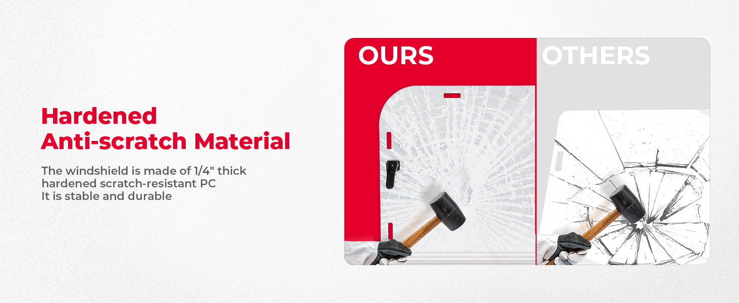 The front windshield is made of PC transparent material, which can provide a clear vision for you and will not affect your driving. It crafted with professional grade 1/4" thick hardened scratch-resistant PC for maximum stability and durability.
