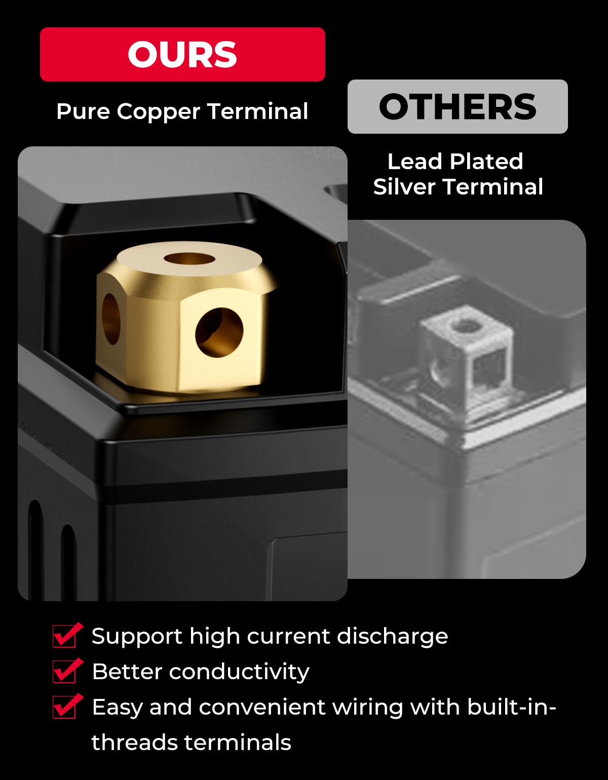 The sealed battery is featured with a power display and pure copper terminal to support high current discharge and better conductivity. The starting power of the battery 12v is 480A and the cold cranking ampere (CCA) is 180A.
