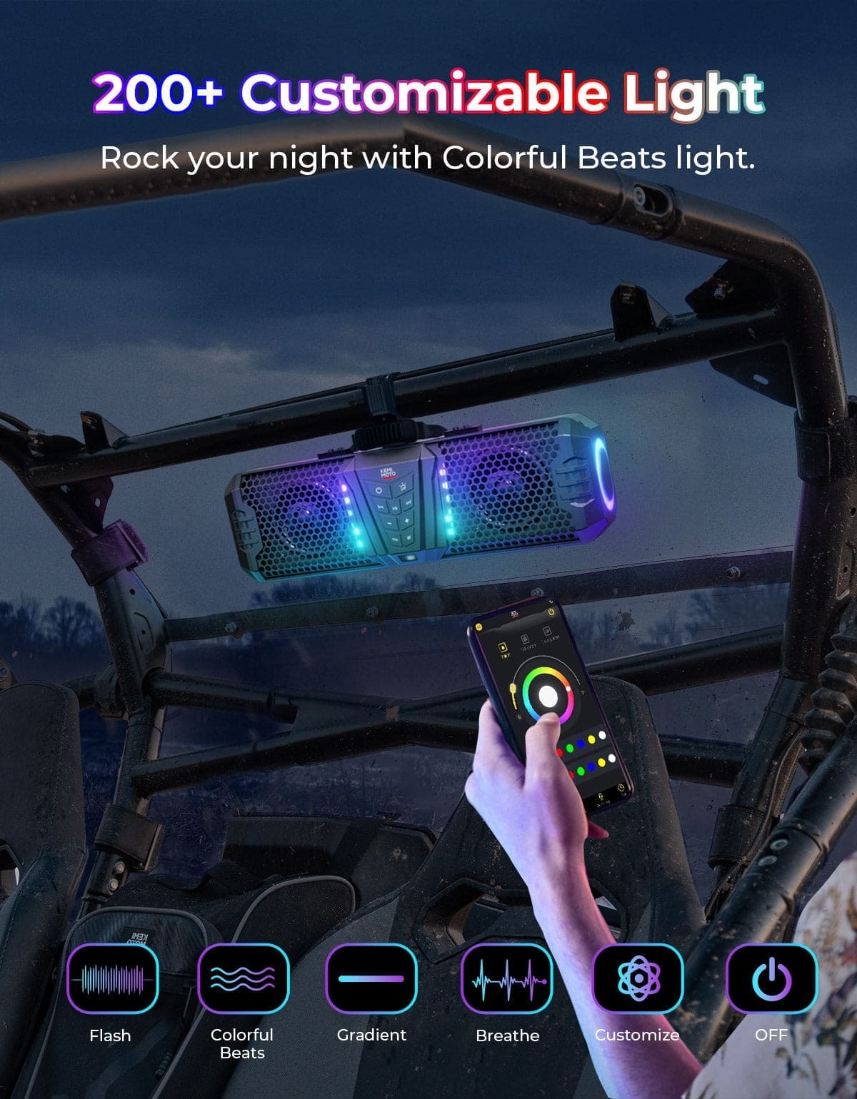 Kemimoto Midnight 40B UTV sound bar features a 5-side ambient ARGB light with 200+ lighting modes (iRISBeat music sync, fade, flash, jump, solid, or OFF etc.) via APP. In Colorful Beats Mode, the LED lights synchronize with music beats, creating a lively and dynamic ambiance for parties and rides. Plus, in low-light conditions, you can turn on the all-white reading light in DOME Mode to read maps, or manuals to enhance the visibility.