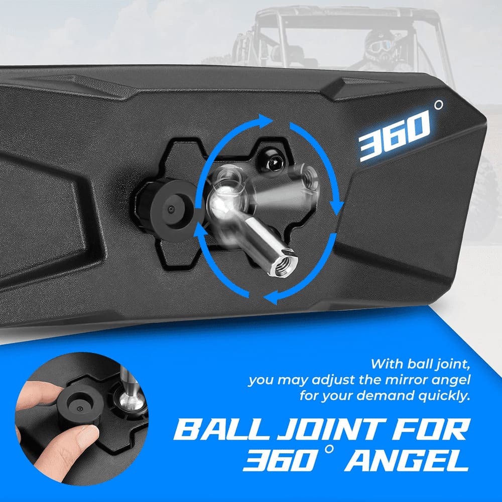 The Polaris Ranger rear view mirror is designed with screws to ensure it stays firmly in place, even during rough terrains. It has a ball-joint design that allows for 360-degree rotation. To adjust the mirror to a better viewing angle, simply loosen the thumb screw and then tighten it to secure the mirror in place without the need for any tools.