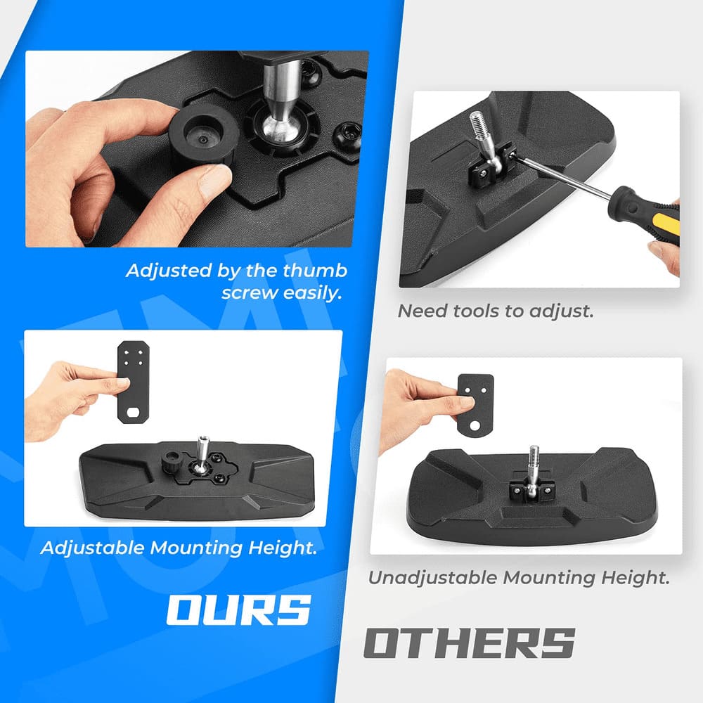 The outter layer is reinforced with screws to prevent mirror from falling out during rough terrains. The mounting bracket provides two level of mounting position so that you can choose the one that fits your demand.