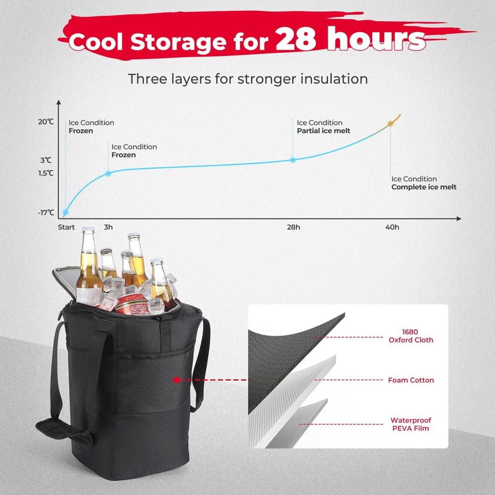 The cooler bag is wrapped with three layers for strong insulation-- Waterproof PEVA Film for cool heat storage, Foam Cotton for protection, 1680 Oxford Cloth for water and scratch resistance. With waterproof zipper, it's fully insulated and leak-proof, so you don't have to worry about any spills or leaks even the bag turned upside down.