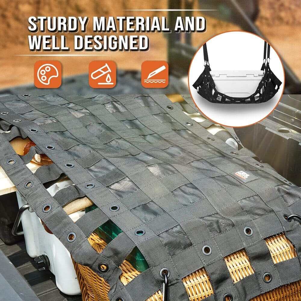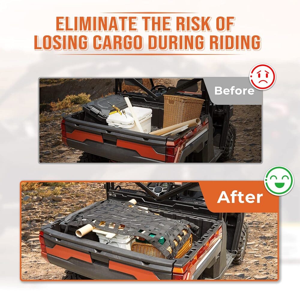 UTV cargo bed box nets are made of durable materials with ultra-high-strength netting and integrated ripstop meshing, what's more, cargo nets are webbing stitched in a grid, typically with several anchor points for securely fixing your valuable items.