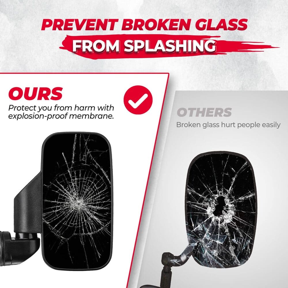 Kemimoto Side mirrors are flexible and adjustable. UTV side mirrors can be folded in when the mirror gets smacked by tree branches.