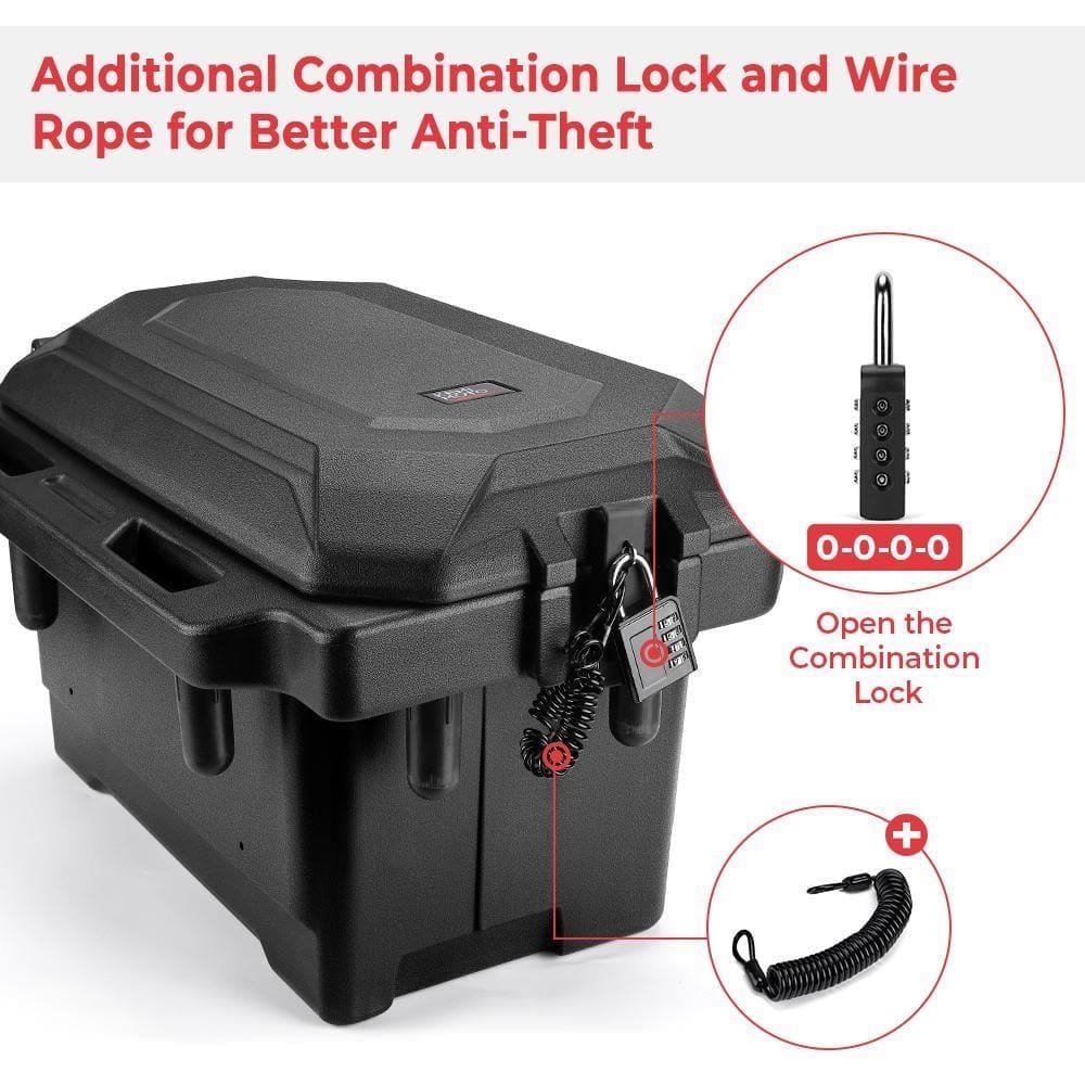 With heavy-duty lid and durable low-density LDPE polyethylene material in textured black, this storage box can bear 100kg+, better pressure-resistant. Additional combination wire rope can protect your box from being stolen.