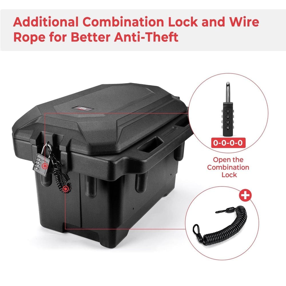 With heavy-duty lid and durable low-density LDPE polyethylene material in textured black, this storage box can bear 100kg+, better leak-resistant and pressure-resistant. Additional combination lock and wire rope can protect your box from being stolen.