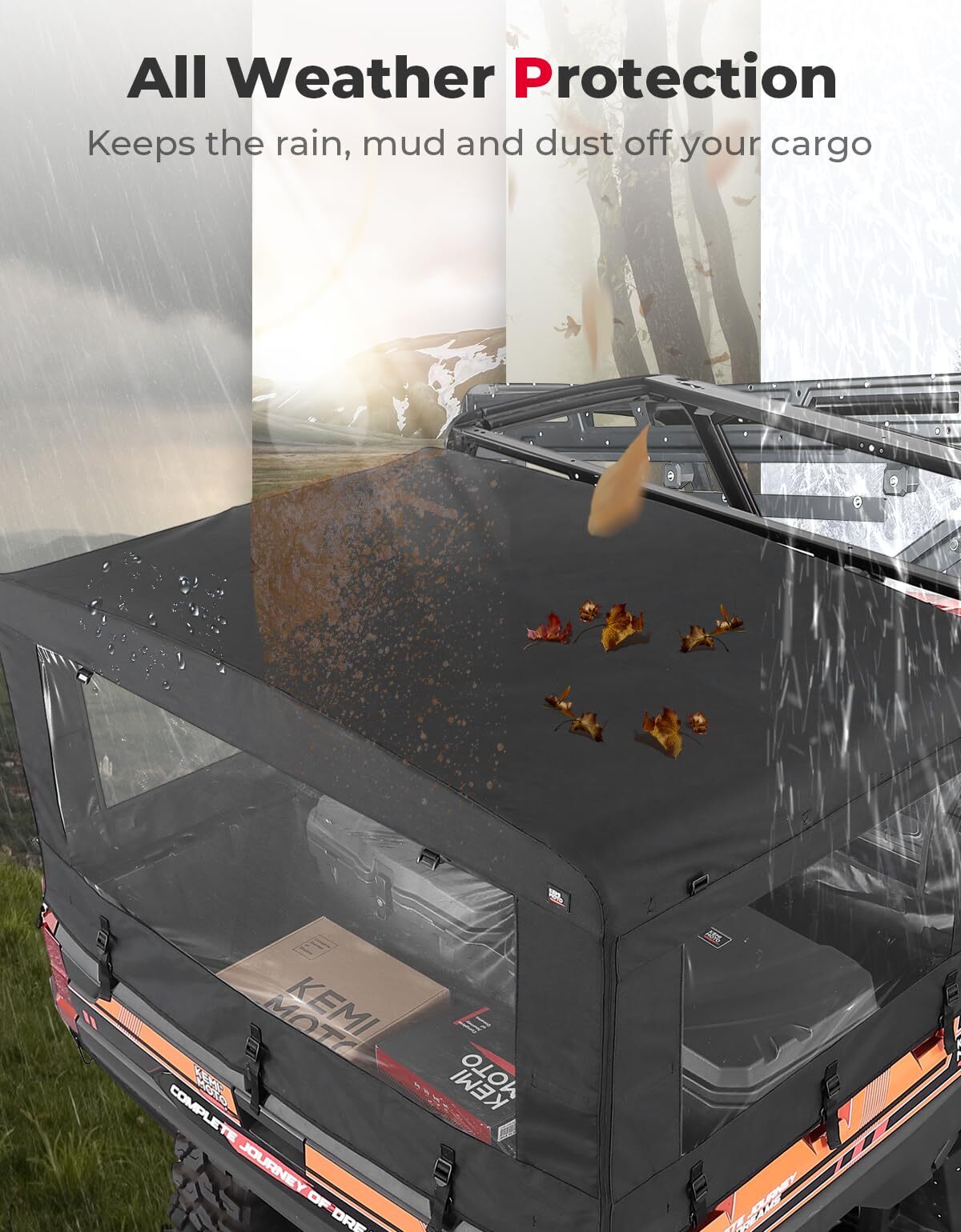 Kemimoto UTV cargo bed cover made of steel frame with tubular support bows. 600D water-resistant Oxford fabric with transparent windows. It effectively shields against wind, snow, sand, mud, and tree branches, and blocks rain and UV.