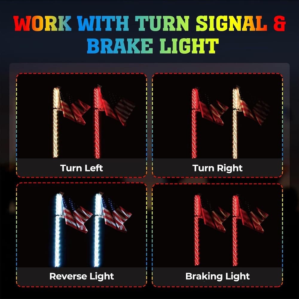 Kemimoto Bluetooth-controlled led whip lights for utv can be connected to taillights and turn signals for brake light and turn signal functions. Please refer to the manual for specific wiring connections.
