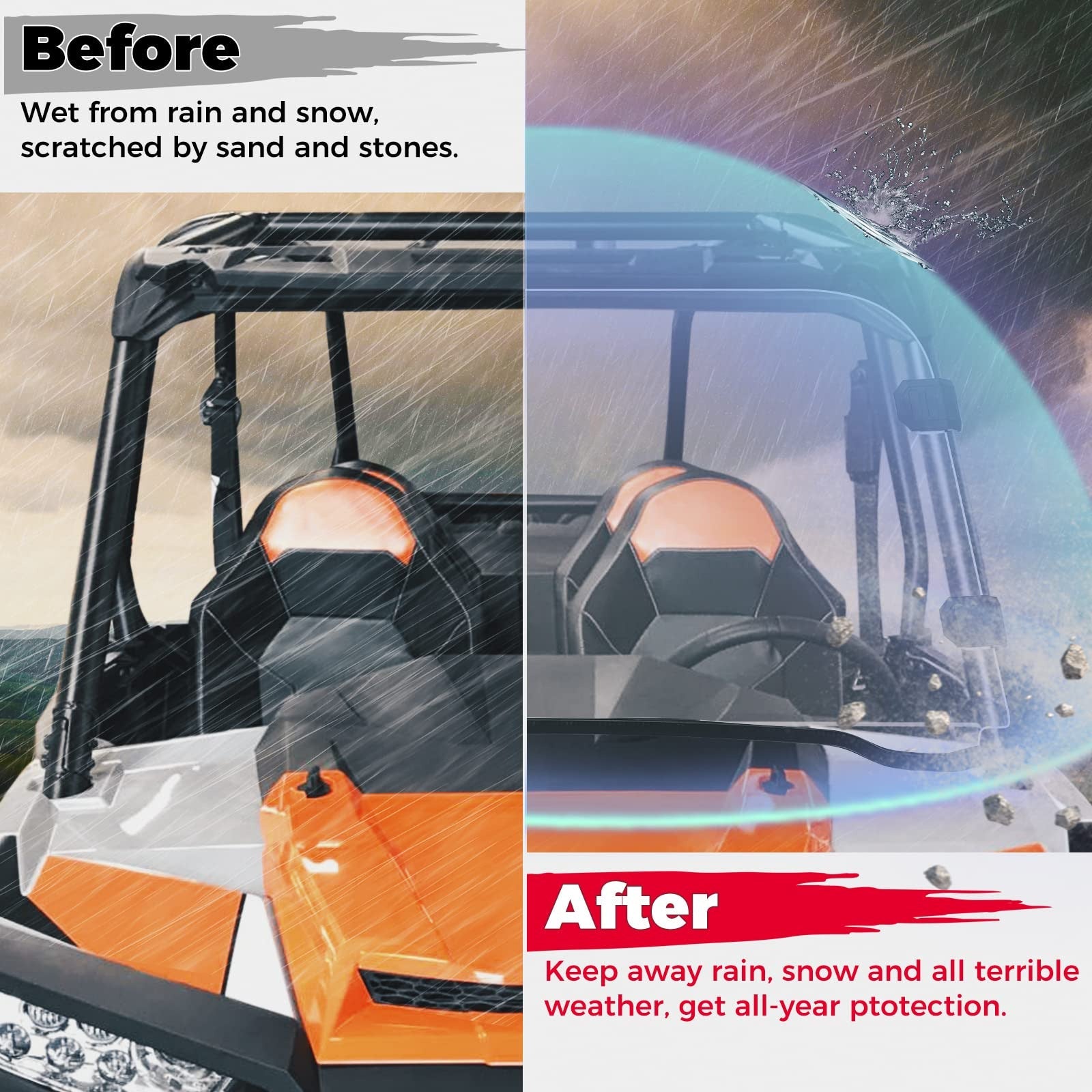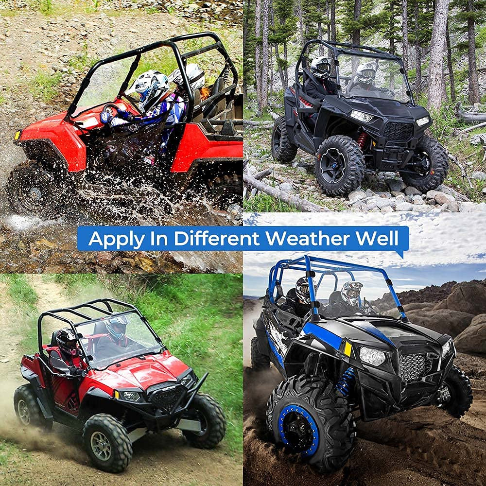 This windshield is accurately made according to UTV frames, thickened bottom rubber strips ensure a tight connection with the engine cover and does not scratch or damage the hood, preventing dust and water leakage, and make sure to reduce the noise when driving on the rough road.
