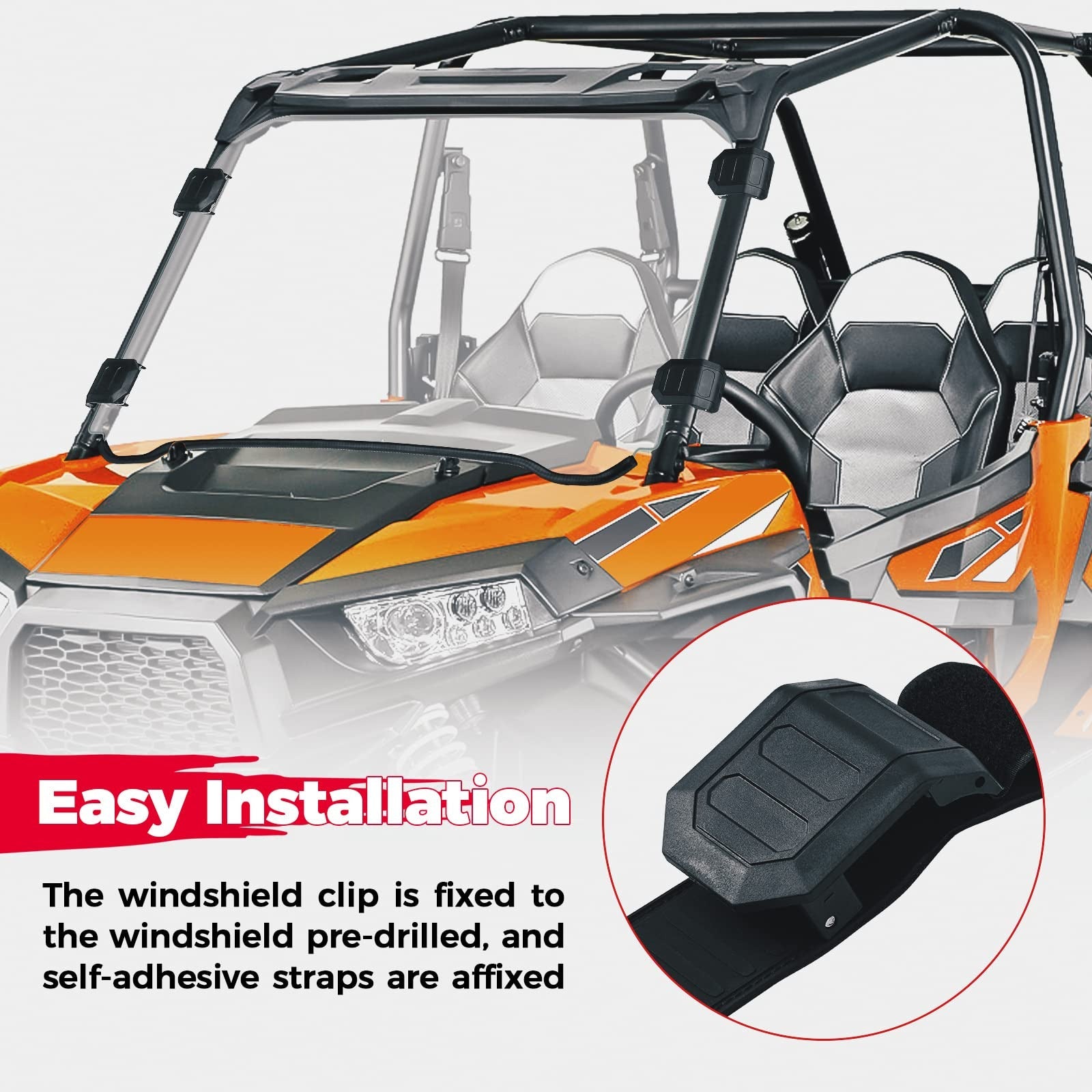 The windshield clamp is sturdy, it can be firmly secured in the windshield pre-drills hole, installation needn't buy any tools, and widened self-adhesive straps makes windshield simple to installation and detachment; Rubber pads firmly connect the windshield prevent friction. And won not rust or scratch your roll bar.