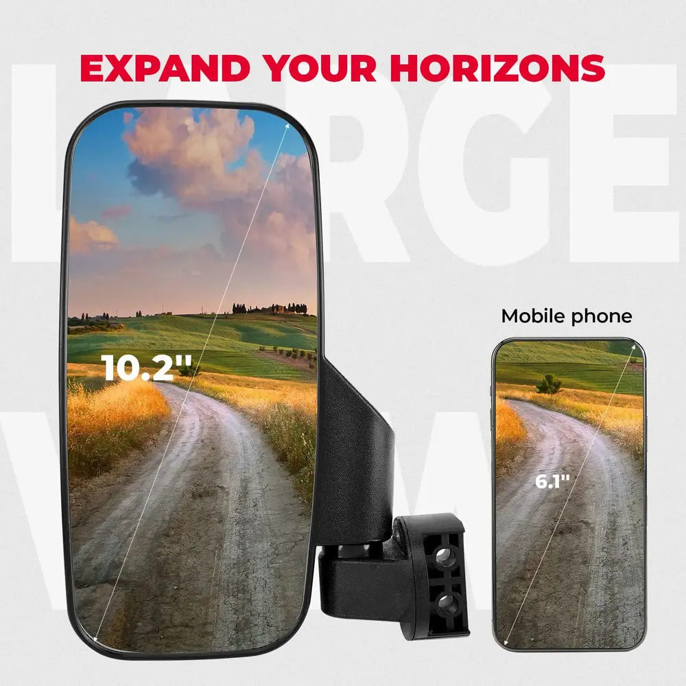 UTV rear view side mirror is 4.7" wide by 10" tall. Compared with other mirrors on the market, they can make you have maximum view. In addition, the design of the convex mirror also provides you wider view than the flat mirror provides.