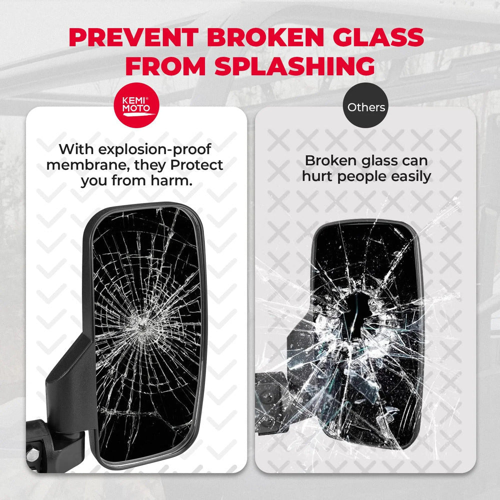 Kemimoto UTV side mirrors are made of high impact ABS housing with upgraded material to avoid breakage when driving on rough terrains.