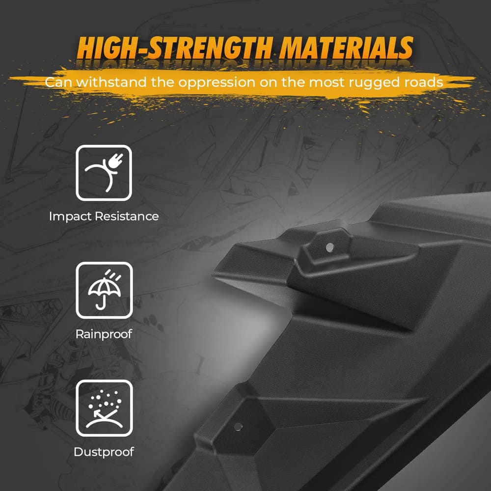 The mud fenders compatible with rzr are made of high-quality polypropylene. Fender flares compatible with rzr xp 1000 are not easy to break and have friction resistance, impact resistance, heat resistance, rainproof, and dustproof features.