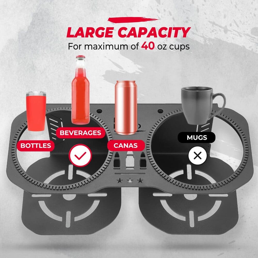 The passenger grab handle cup holder can hold most 18-40 OZ water bottles, which is compatible with Yeti 20-36oz, Hydroflask 32 40oz, Nalgene 16-40oz, Camelbak 32 40oz, Contigo, Tervis, etc.
