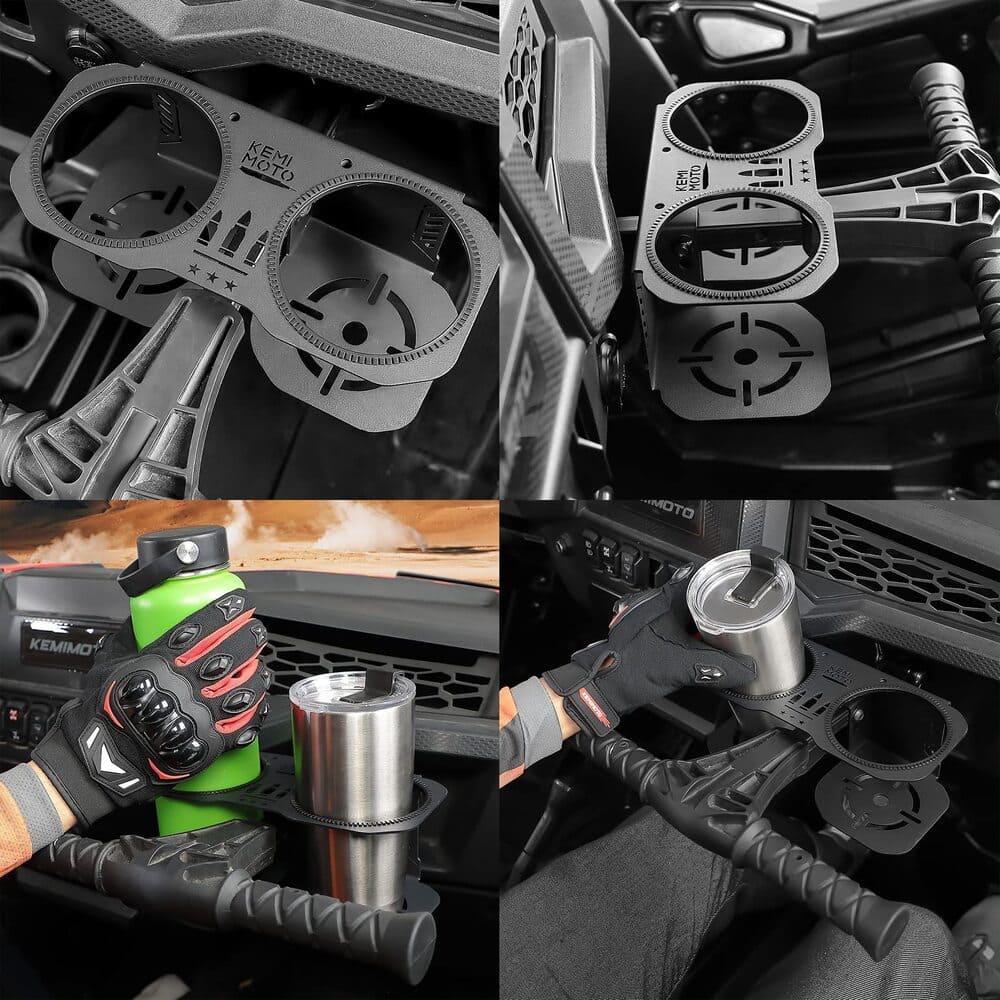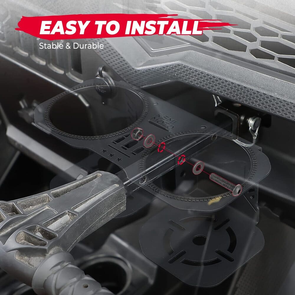 The cup holder for RZR is made of strong steel, with a surface-resisting float process for the lid that is effective in preventing scraping. Long lasting and will never rust, peel or corrode. The Handle Drink cup holder has been upgraded with a wider bottom to give the water bottles more stability during driving.
