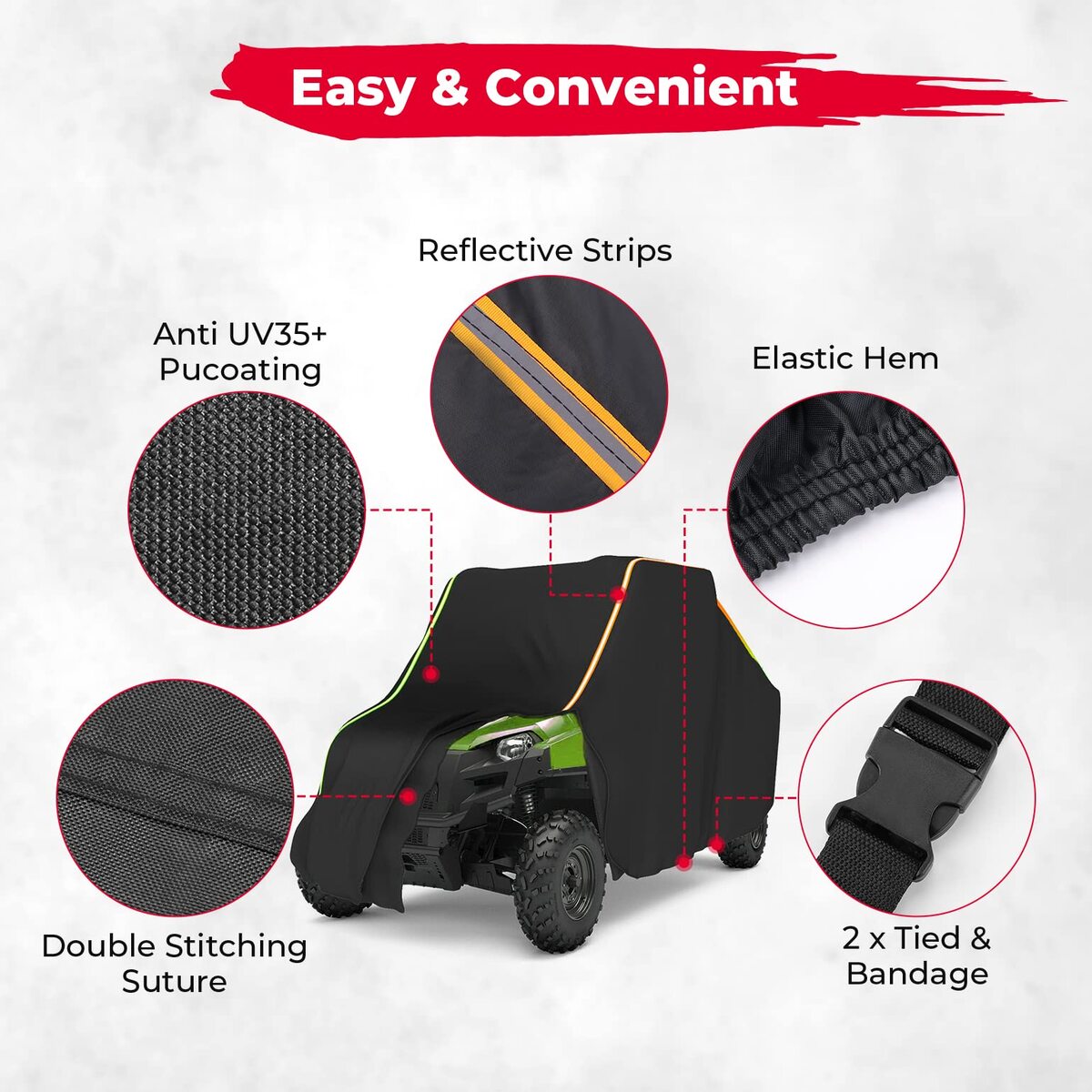 The cover is designed with a double-stitched seam elastic band and an adjustable elastic cord at the bottom, which is compatible with RZR, allowing it to adjust to the suitable size easily, providing excellent security on high windy days. There are two reflective strips on both sides, that help others perceive objects in dark, and protect your UTV from scratches as people walk by the area where it sits. And it is easy to line the cover-up when putting it on.