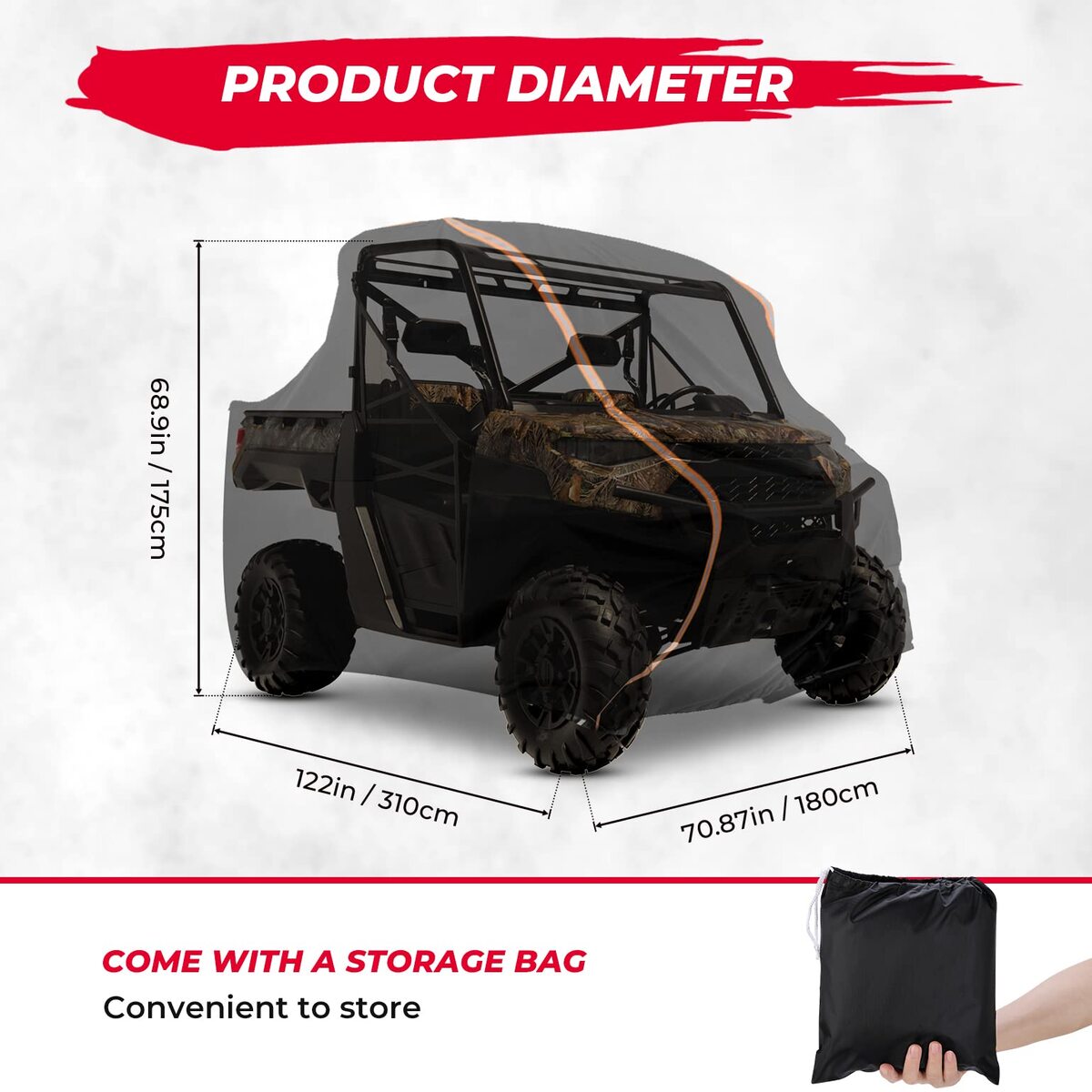 Made with innovative heavy-duty polyester black oxford cloth with waterproof PU coating and U V-Resistant coating in the backing, utv storage cover is a highly flexible material and will not cause friction damage to the locomotive paint caused by the movement of the car. Side by side cover has four holes on each side, which can tie the cover to the four wheels and keep it in place when the wind blows.
