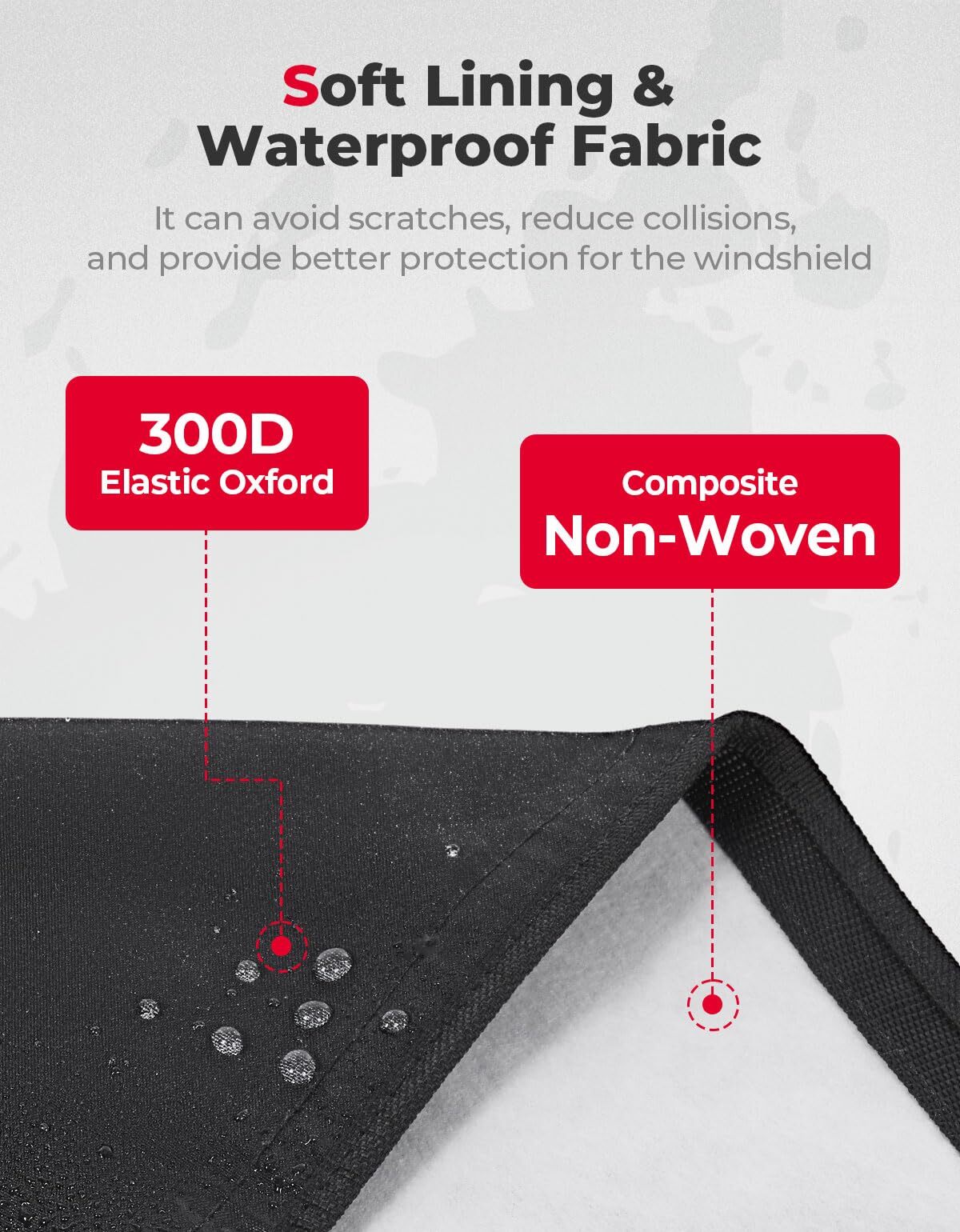 We are using 300D elastic oxford fabric on the front, which is scratch-resistant and waterproof, ensuring it can withstand rain and snow. Are you worried about this cover scratching your windshield? No worries, we have added a protective padding that provides cushioning.