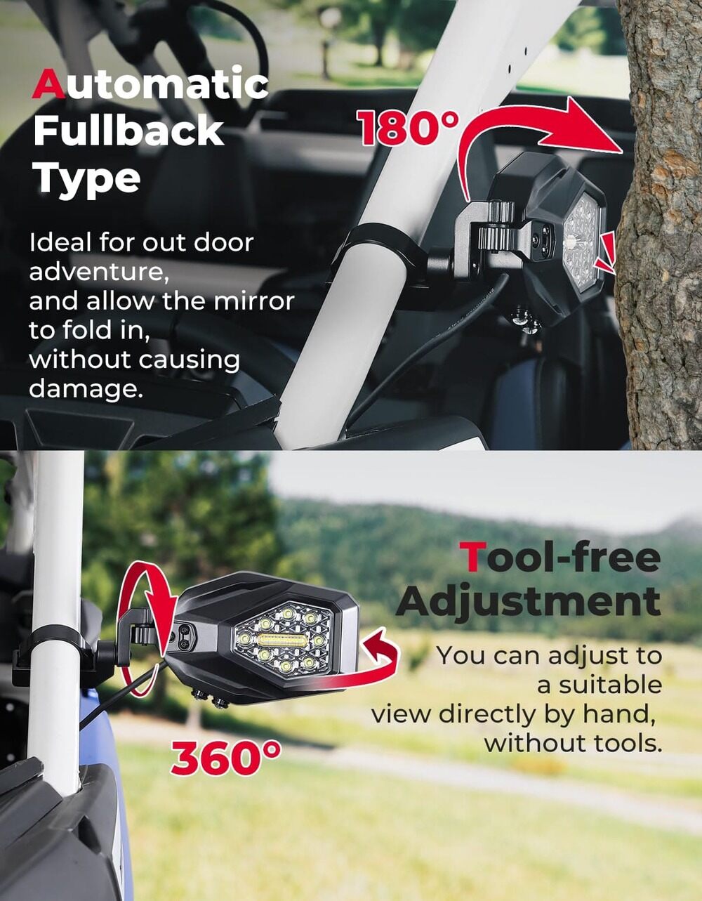 KEMIMOTO UTV LED lighted side mirrors provide 3 additional night vision light, offer emeral Hawkeye Light can help you to find obstacles on the ground in time when getting on and off.The damber flowing turn signal light and spot ligght that make the driver safer when racing. Greatly enhance night vision and night driving ability, while the dazzling lights can make you stand out from the crowd.