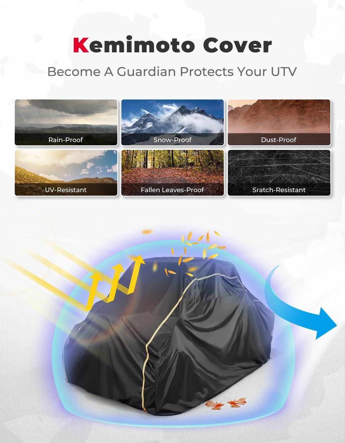 Kemimoto 4-seat UTV cover is designed with an adjustable Strap across the center of the body underneath to avoid blowing away even during windy days.