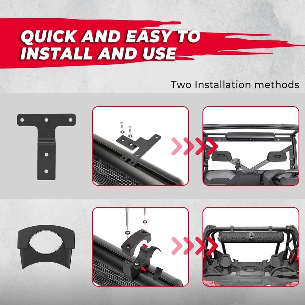 - Two Tyoes of Mounting Brackets: 1. O- Ring mounting brackets: Universal Fit for 1.56-2.25 Roll Bar Cage; 2. T- Type mounting brackets: The drilling needed to install the kemimoto utv sound bar in the flate surface.