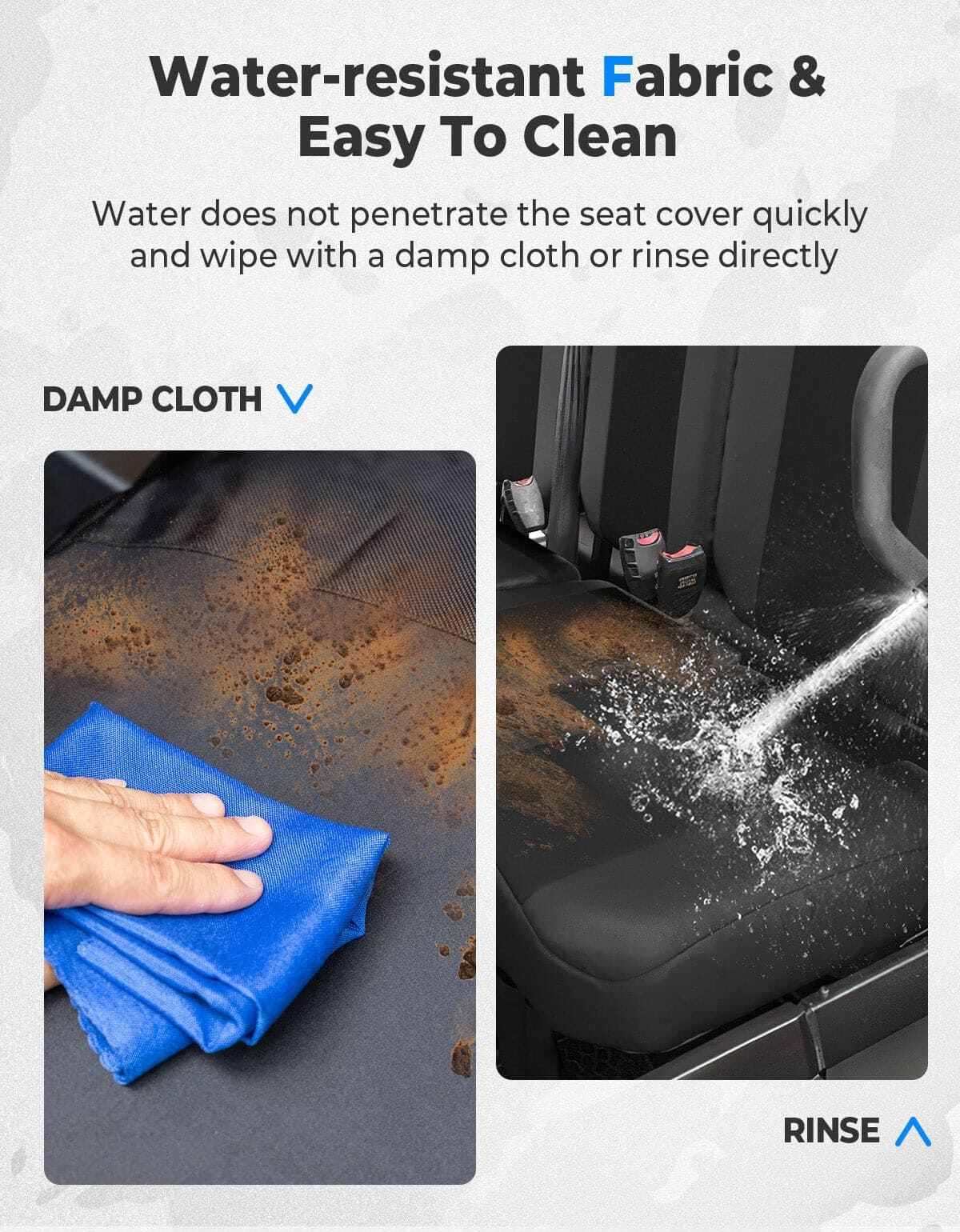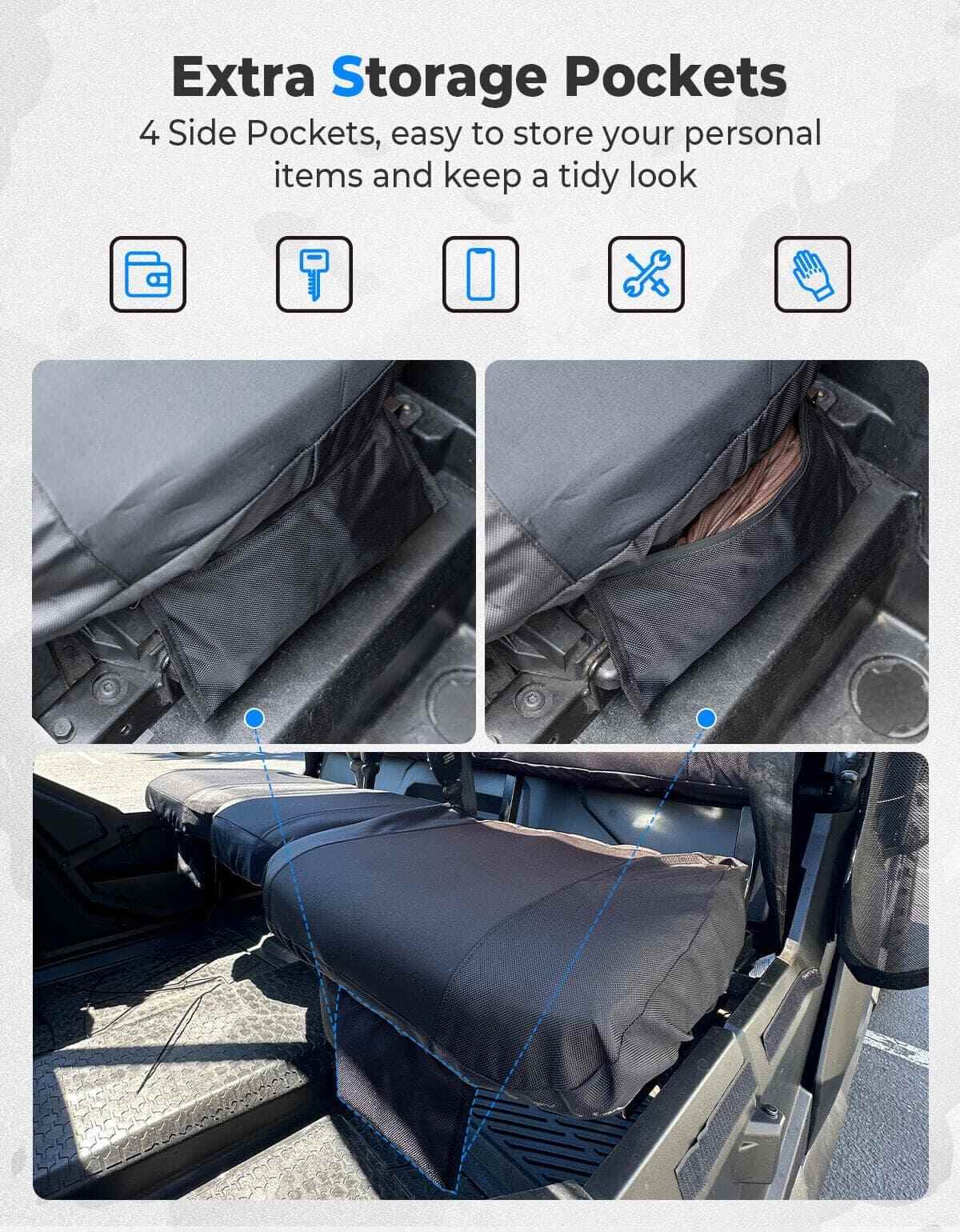 Kemimoto UTV seat cover is water-resistant and scratch, can protect the original vehicle seats from the sun, rain, dust, stains, and scratches, and extends the service life of the seats.