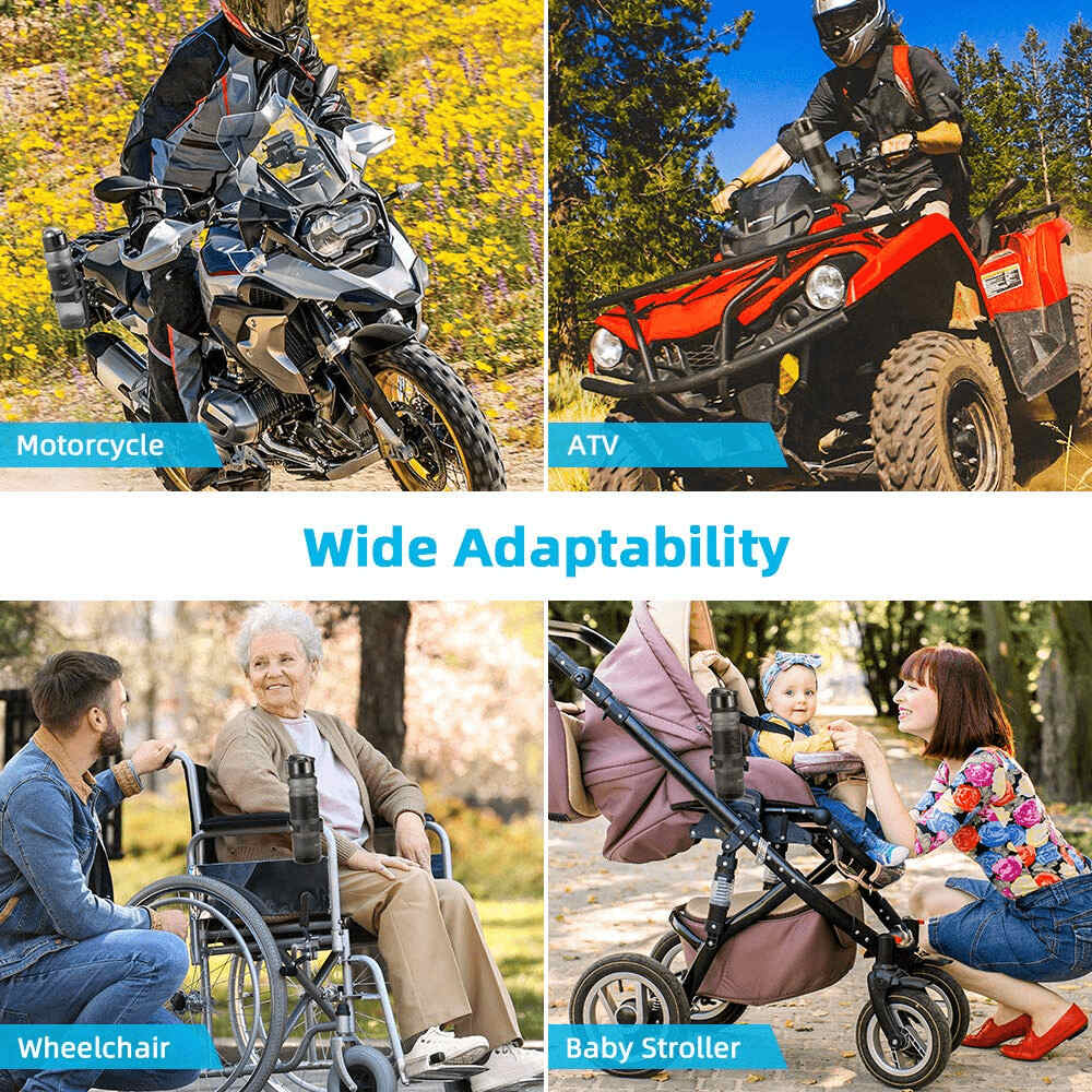- Universal Fit for motorcycles / bikes / atv / wheelchairs / prams / desk.
