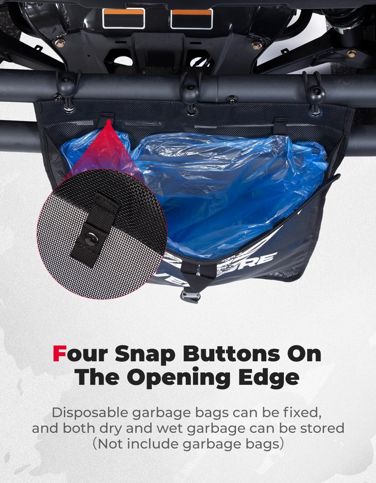 Our UTV Mesh Trash Bag(600x480x100mm) is designed with adjustable buckle straps, allowing you to customize the length of the bag between 450-600mm. The four snap fasteners at the opening edge are specifically designed to securely hold disposable garbage bags (not included), providing an easy and effective waste management solution.
