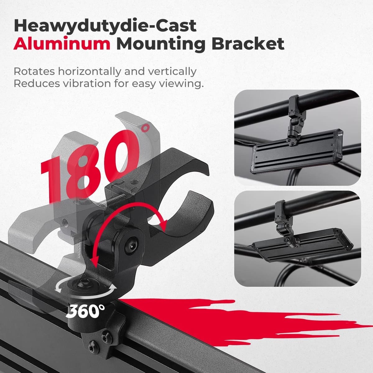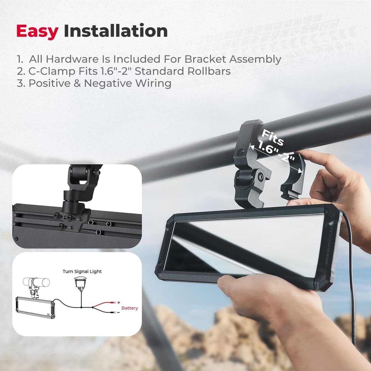 Built with a sturdy and durable aluminum alloy bracket, provides good protection and greatly reduces the risk of cracking, is stronger and more impact resistant than plastic, and fits most 1.6" To 2" diameter round tube roll cages. An adjustable angle with a ball joint provides you with a wider-angle view and perfect visibility. The product includes a 10.5"-inch rear view mirror, power switch, aluminum bracket, and all necessary hardware.
