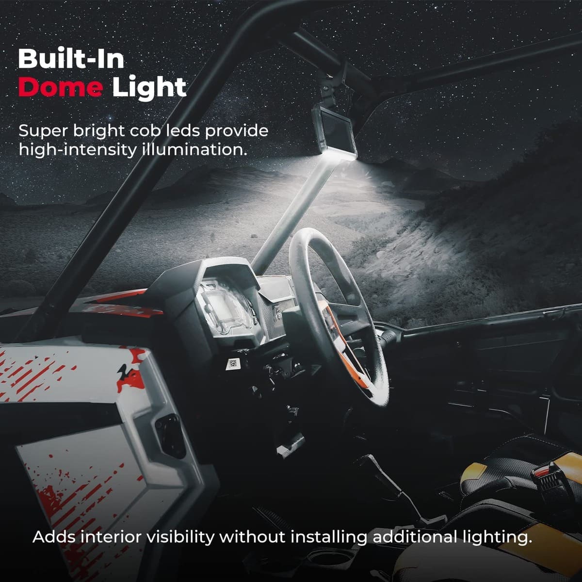 UTV center mirror provides a clear high-definition view day and night without distortion, it is designed with high-intensity COB LED reading lighting, brighter than other lamp beads, more than 50,000-hour lifespan, to help you illuminate your interior in little to no light conditions. Eliminates blind spots effectively for safe driving, and increases visibility and safety, especially at night.