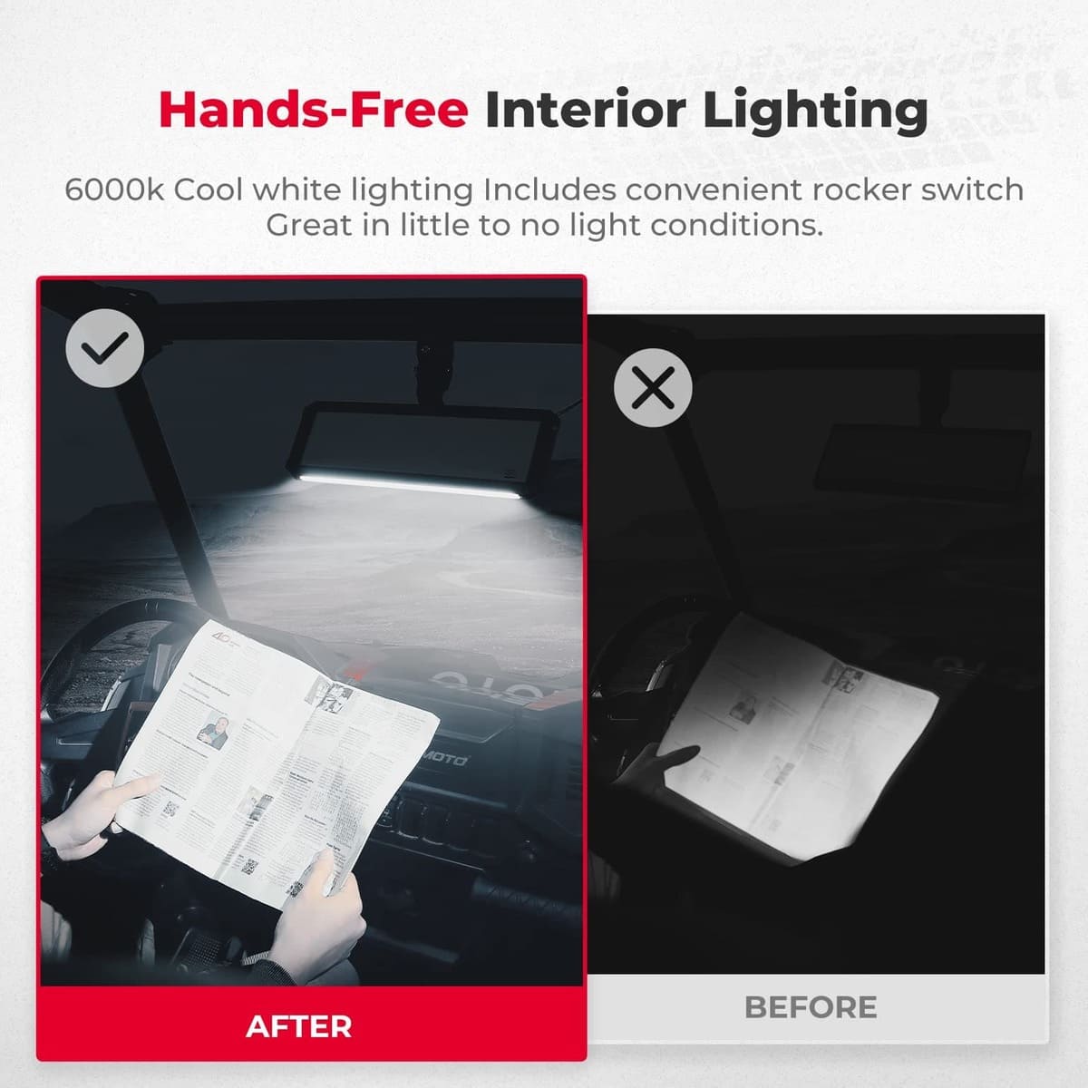 It is easy to give you safe and bright utv space. It comes with an instruction and a panel switch with light, ready to use after simple installation, low power design, reducing battery loss.