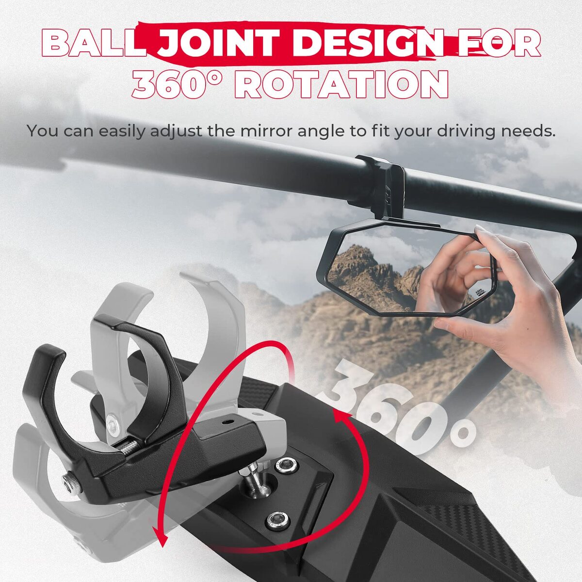 UTV center rearview mirror with 360 Degrees adjustable ball pivot, makes it easier to adjust the angle of rear view mirror for you need. Kemimoto utv mirrors with non-slip tape can hold the mirror more stable, ensures the UTV mirror always keep stable to the roll bar cage in off-road adventures.