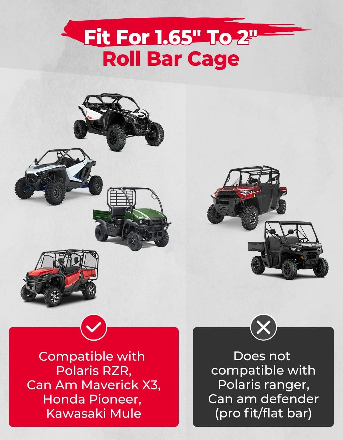 These side mirrors are suitable for UTVs with a roll bar diameter of 1.65-2 inches, making them compatible with popular models like Polaris RZR, Can Am Maverick X3, Honda Pioneer, Honda Talon, Kawasaki Teryx, John Deere Gator, and CFMOTO. Enjoy the versatility of these mirrors with a wide range of UTVs.