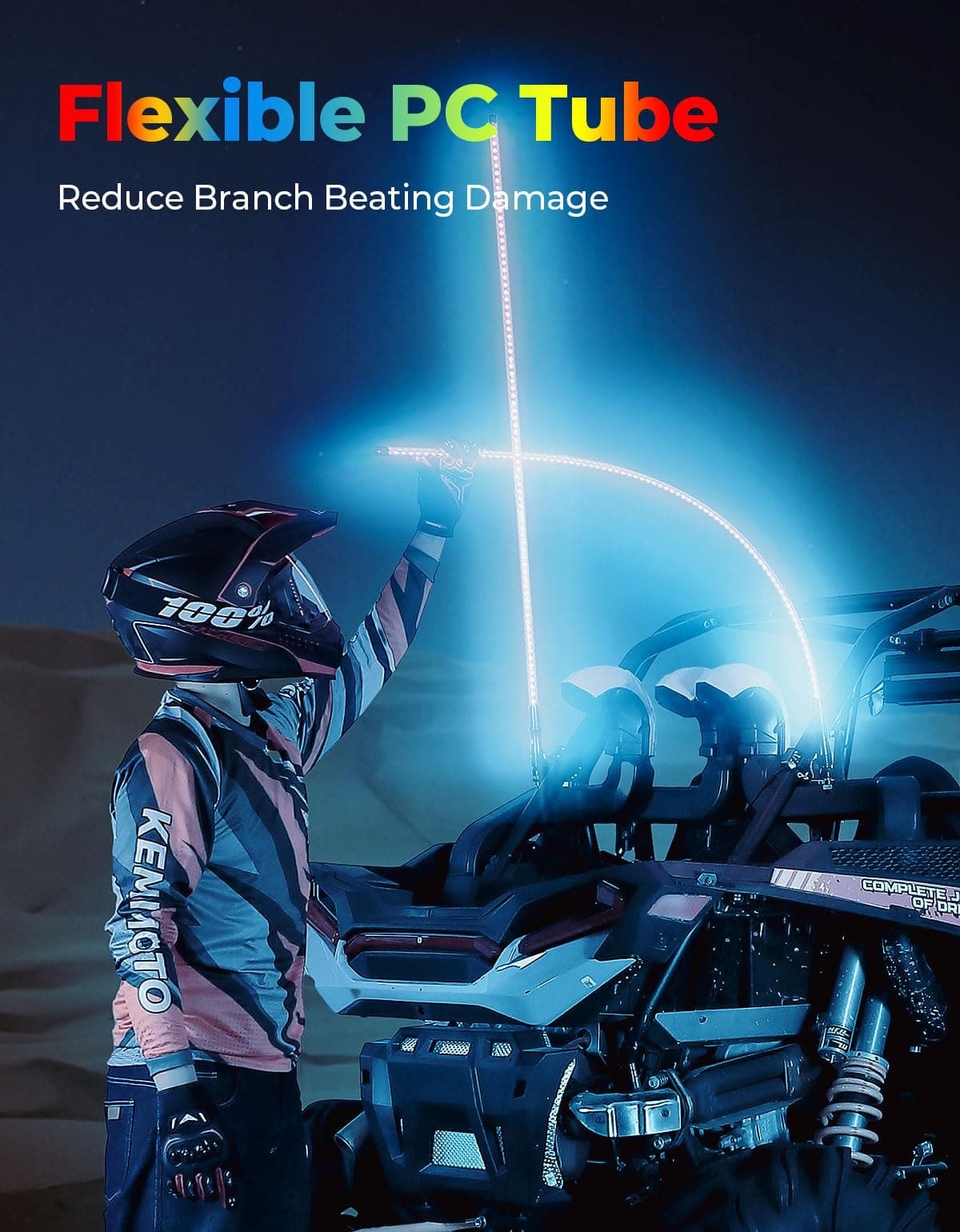 With a dual-sided illumination angle, these whip lights offer 10 speed settings and 5 brightness levels, making you highly visible in the darkest nights and enhancing your safety.