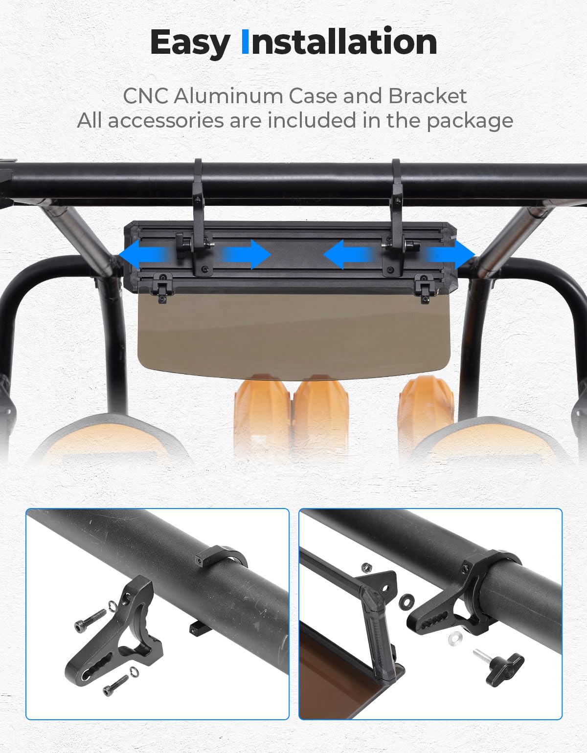 The rearview mirror is adaptable to most UTVs with a roll bar of 1.65-2 inches. Compatible with Polaris RZR/ Pioneer/ Talon/ Can-Am X3/ CFMOTO/ Teryx. This KEMIMOTO mirror can work well with most windshields and roofs. The 180-degree adjustment function allows it to better fit your driving habits.