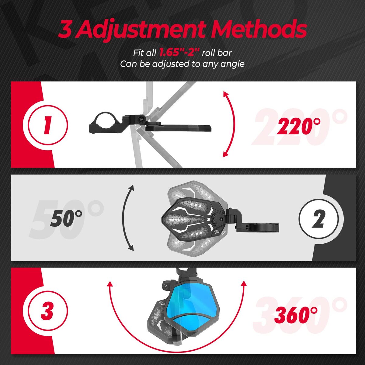 Three Adjustment Methods: Two-axis rotation adjustment can make the utv mirrors side view perfectly compatible with the Can-am ATV UTV Polaris RZR Dune Buggy Sand Rail Go Kart 4 with a tube frame of 1.62" -2". It has a wide range and can be adjusted to any angle you want.