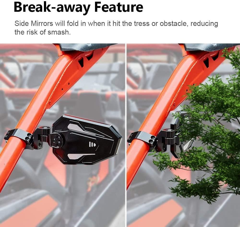 Aluminum RZR Side Mirror will fold in when it hits the tress or obstacle, reducing the risk of smash. 180°adjustable Joint, easy to fold in when park.