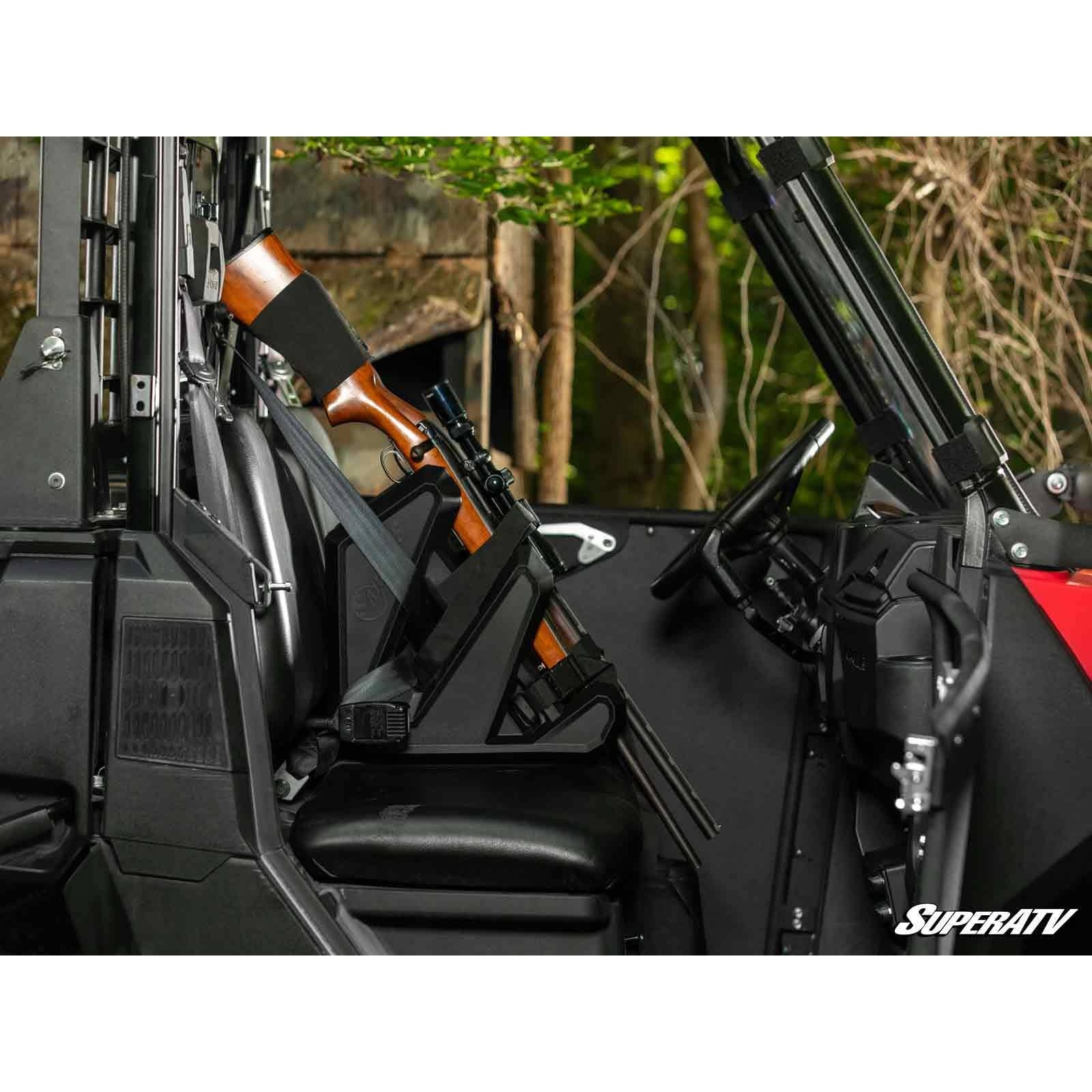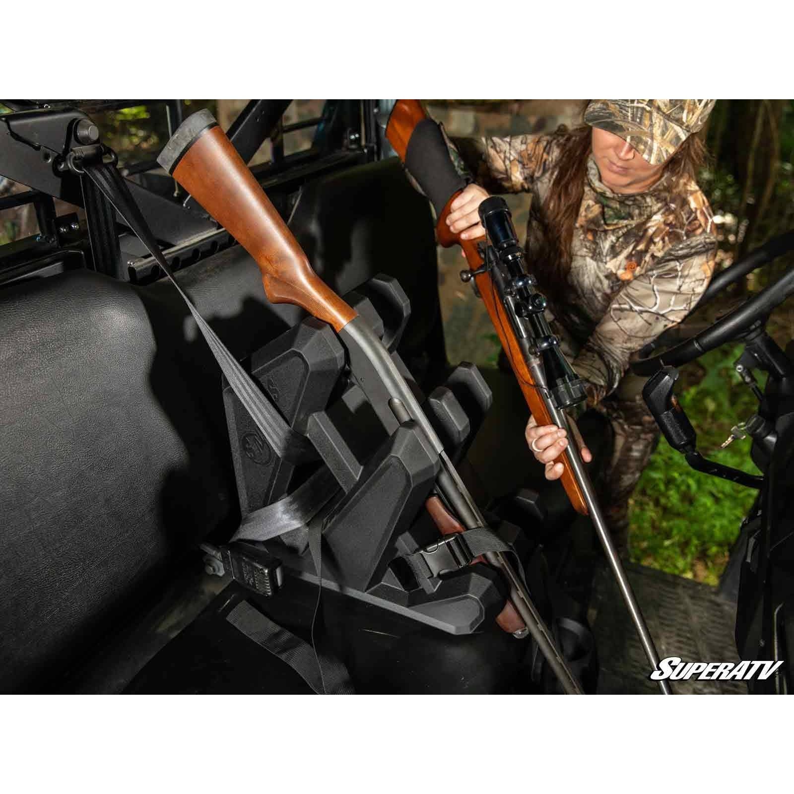 The most frustrating part of any backwoods hunting trip is finding a good place on your UTV to put your rifle or shotgun. You want them to be easily accessible, safe from rain or snow, and protected from big bumps. With SuperATV’s On-Seat UTV Gun Holder, you can turn your center seat into the perfect gun holder in an instant. You can secure and remove two long guns in seconds so you’ll always be ready for big game and bad terrain.