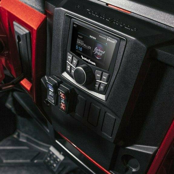 The RFRNGR-PMXDK dash kit is designed to add a Rockford Fosgate PMX-0, PMX-2 or PMX-3 digital marine source unit into select RANGER® models. This kit is custom molded to match the existing dash while retaining use of the electrical switches, 12 volt accessory, and bottom pocket features of the OEM panel. Two insert panels are included in the kit; one for use with the PMX-0, and one for use the PMX-2 or PMX-3. All mounting hardware for the source unit and dash kit are provided.