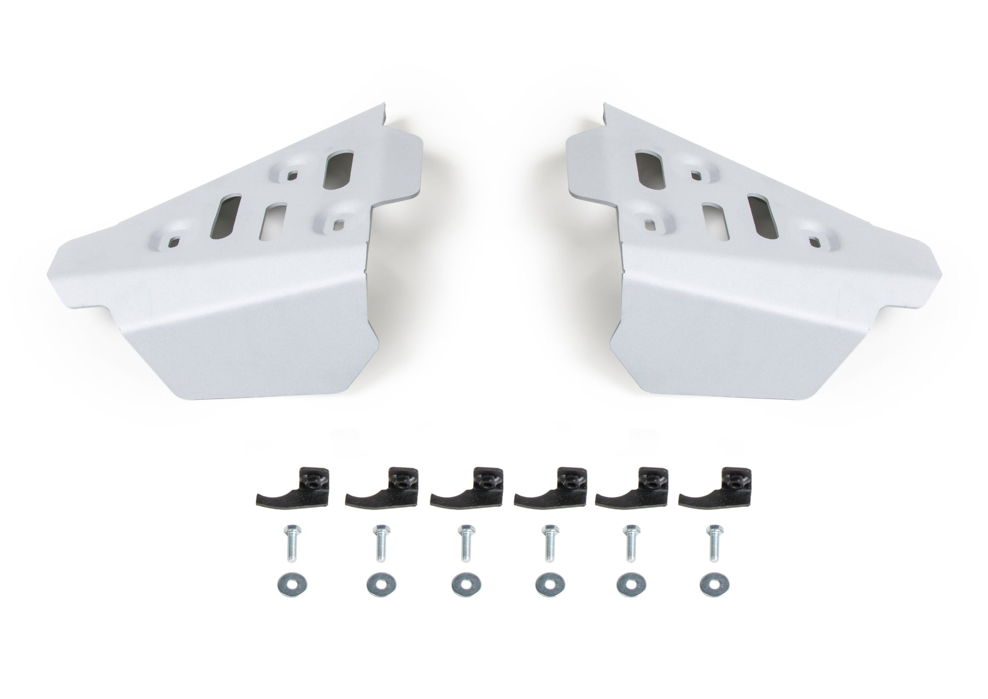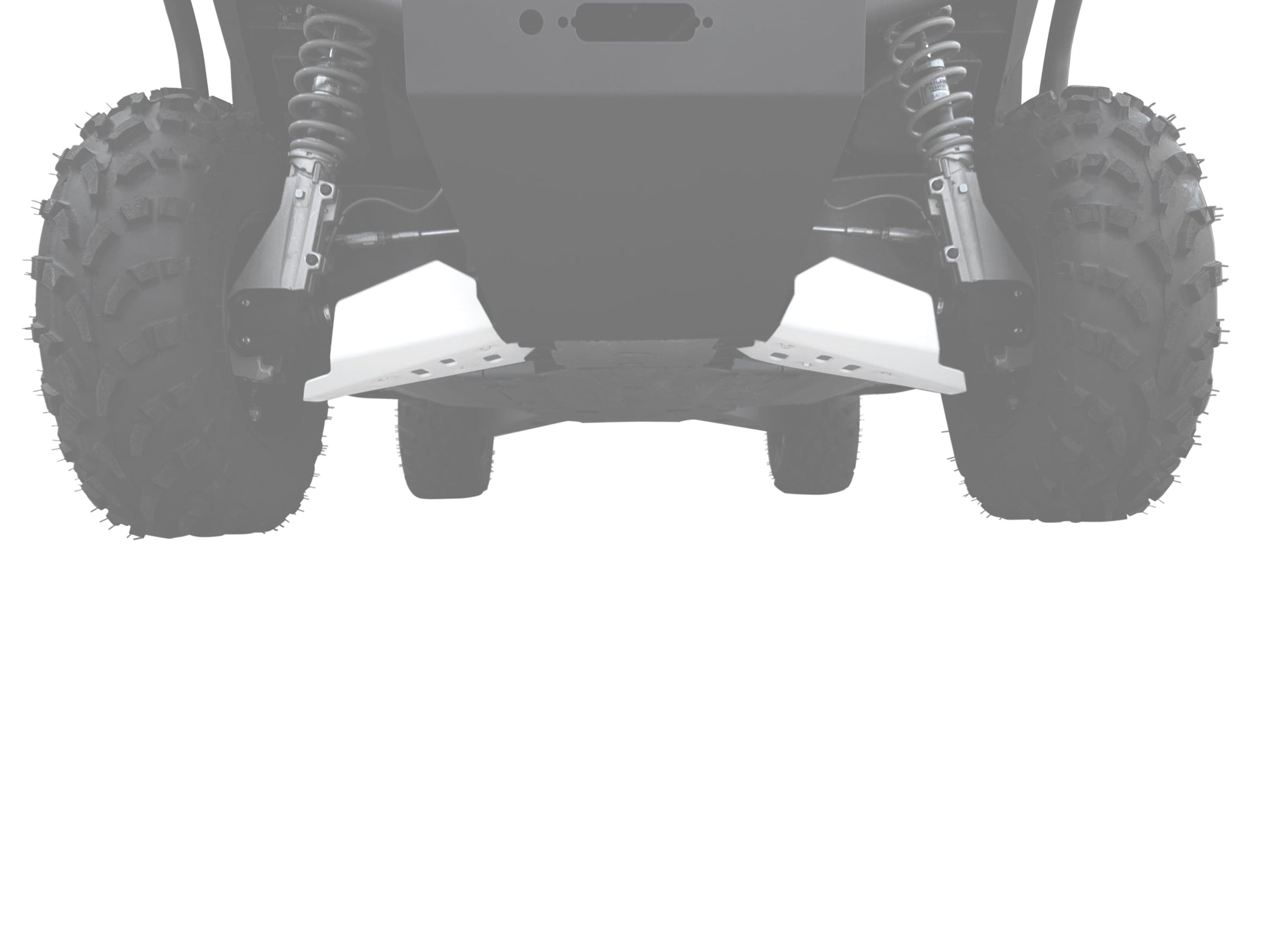 One of the most vulnerable and less protected parts of your Polaris Ranger 570 SP is your A-arms and CV joints. But you can protect both with our 5/32'' Marine grade Aluminum A-Arm Protectors. With a high folded front edge that protects your A-Arms from impact and your CV Boots from sticks hitting and tearing and letting dirt in there to wreck the joints. We also have drain holes on the underside to let dirt, grass seed, and sand that has built up to fall out or be washed out. Our A-Arm Guards utilize both factory mounting points and steel brackets to give maximum strength when mounting. We also use a stamping procedure to allow extra strength for the A-Arm Guard and for our high strength bolts to be recessed to allow a flat surface for sliding over any obstacle you might come across on the trail. PART NUMBER ONLY INCLUDES FRONT A-ARM GUARDS